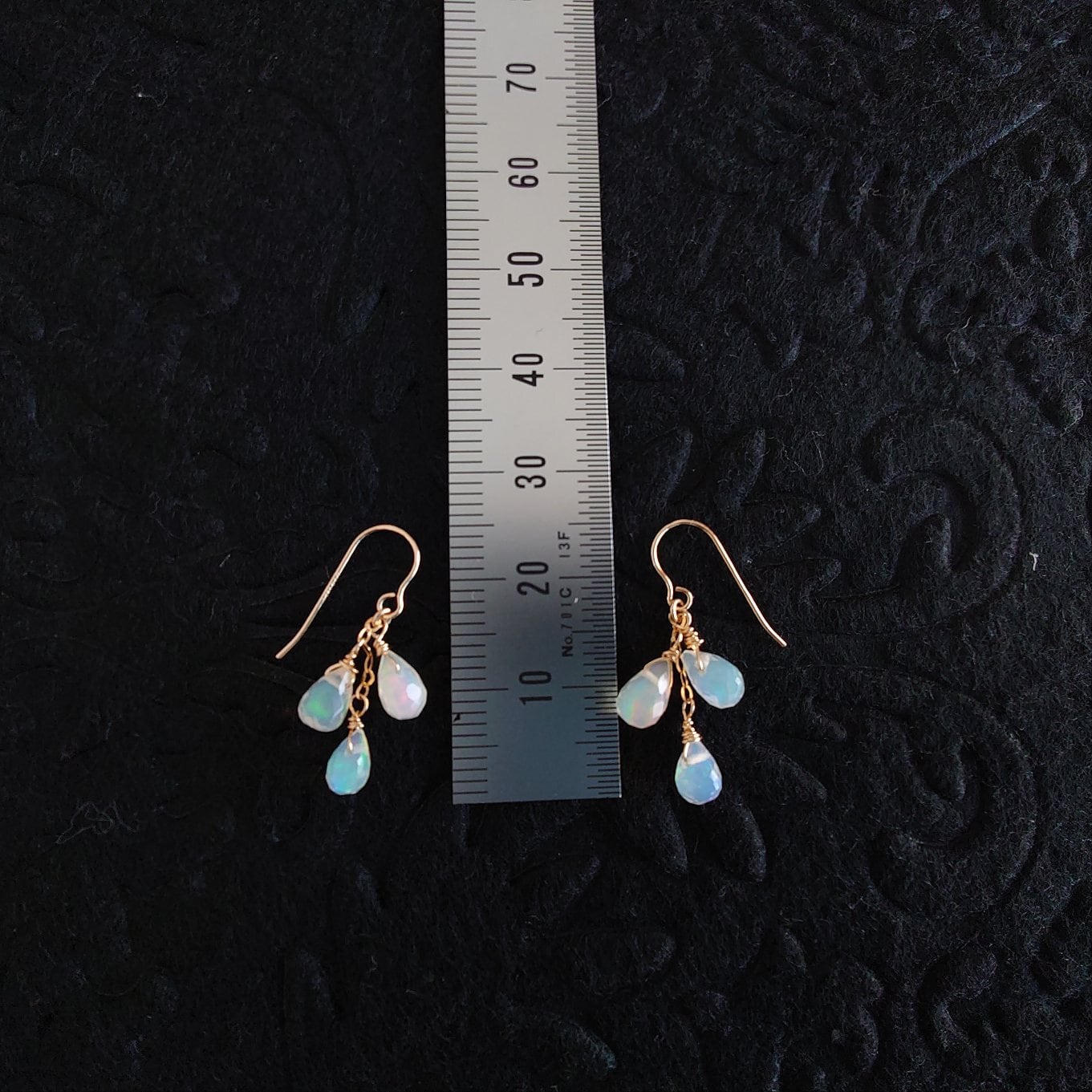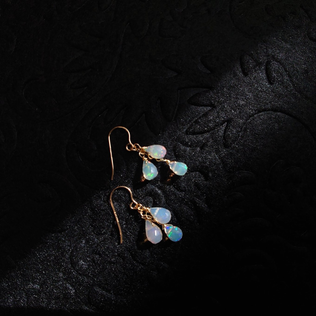 3粒のプレシャスオパールが、耳元で優しく揺れて遊色の華やかな輝きを放ちます。