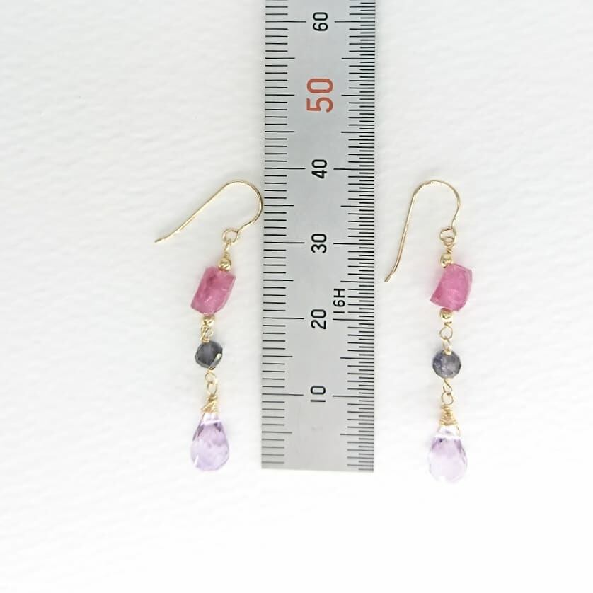 ドロップカットのピンクアメジストとラフロックのピンクトルマリンに丸面カットのアイオライトを合わせたピンク系カラーのフェミニンなピアスです。