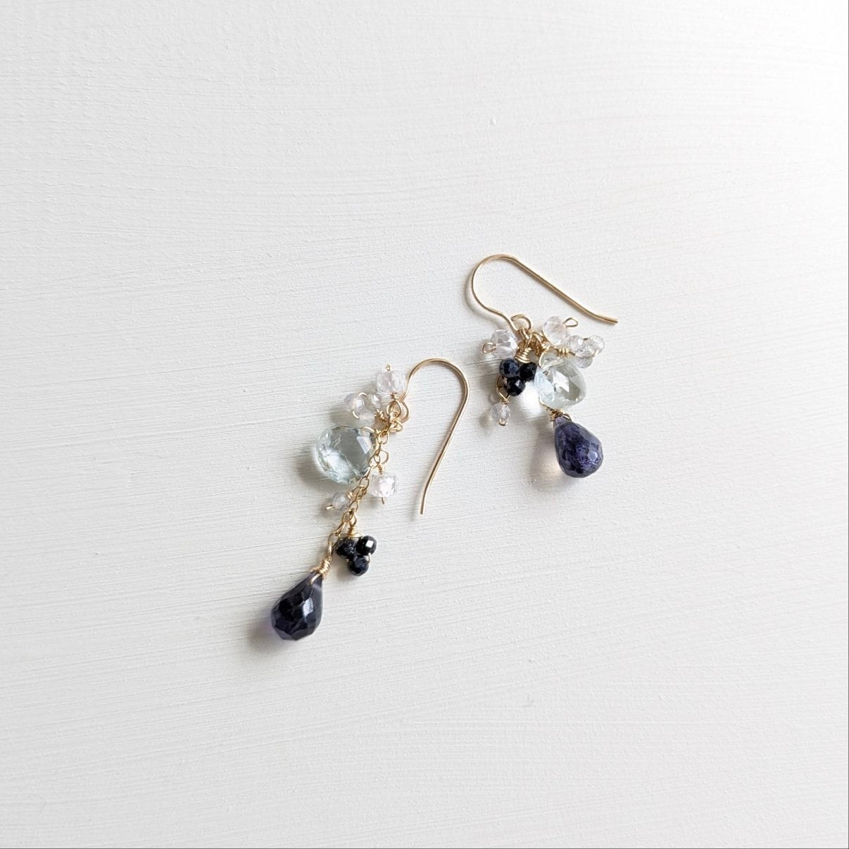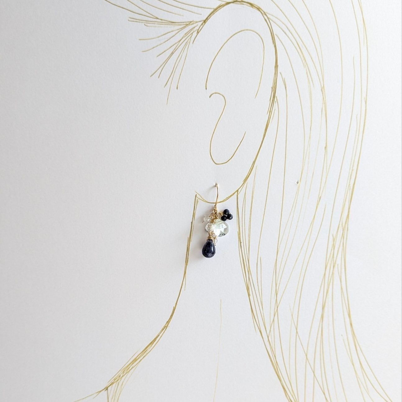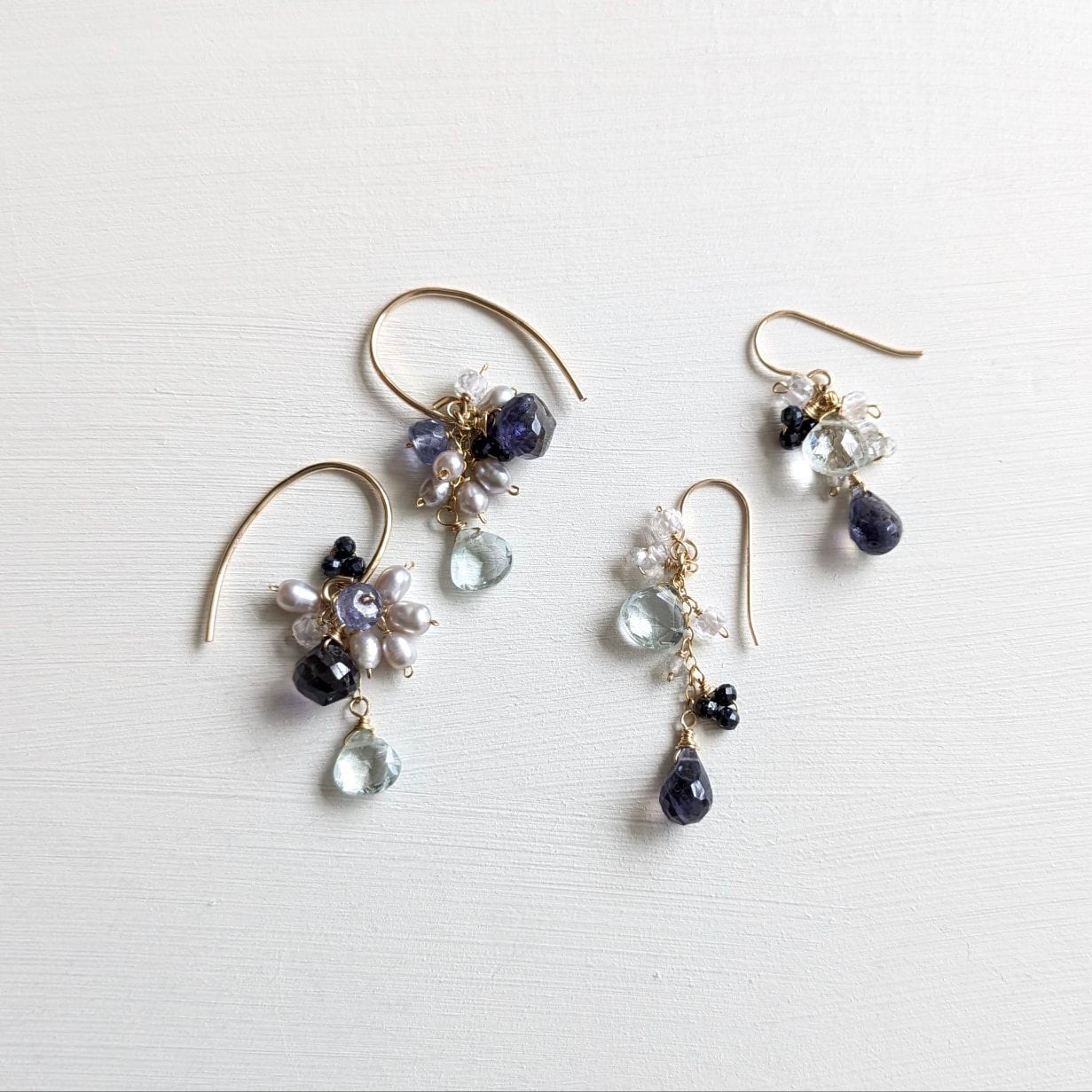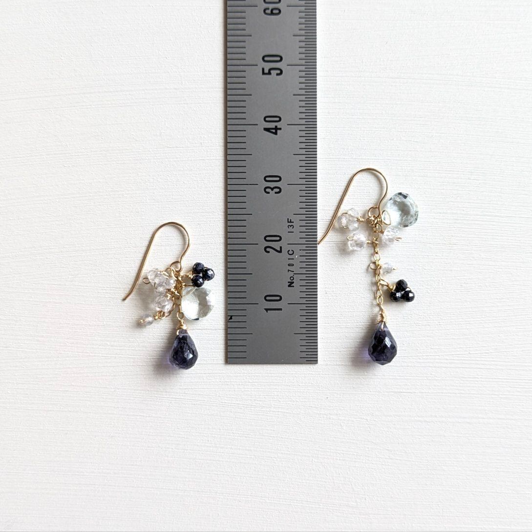 アイオライトの深みのある青紫がさりげないアクセントとなり、天然ジルコン、サファイア、ラブラドライトとともに、耳元に静かに揺れる青のグラデーションを描きます。