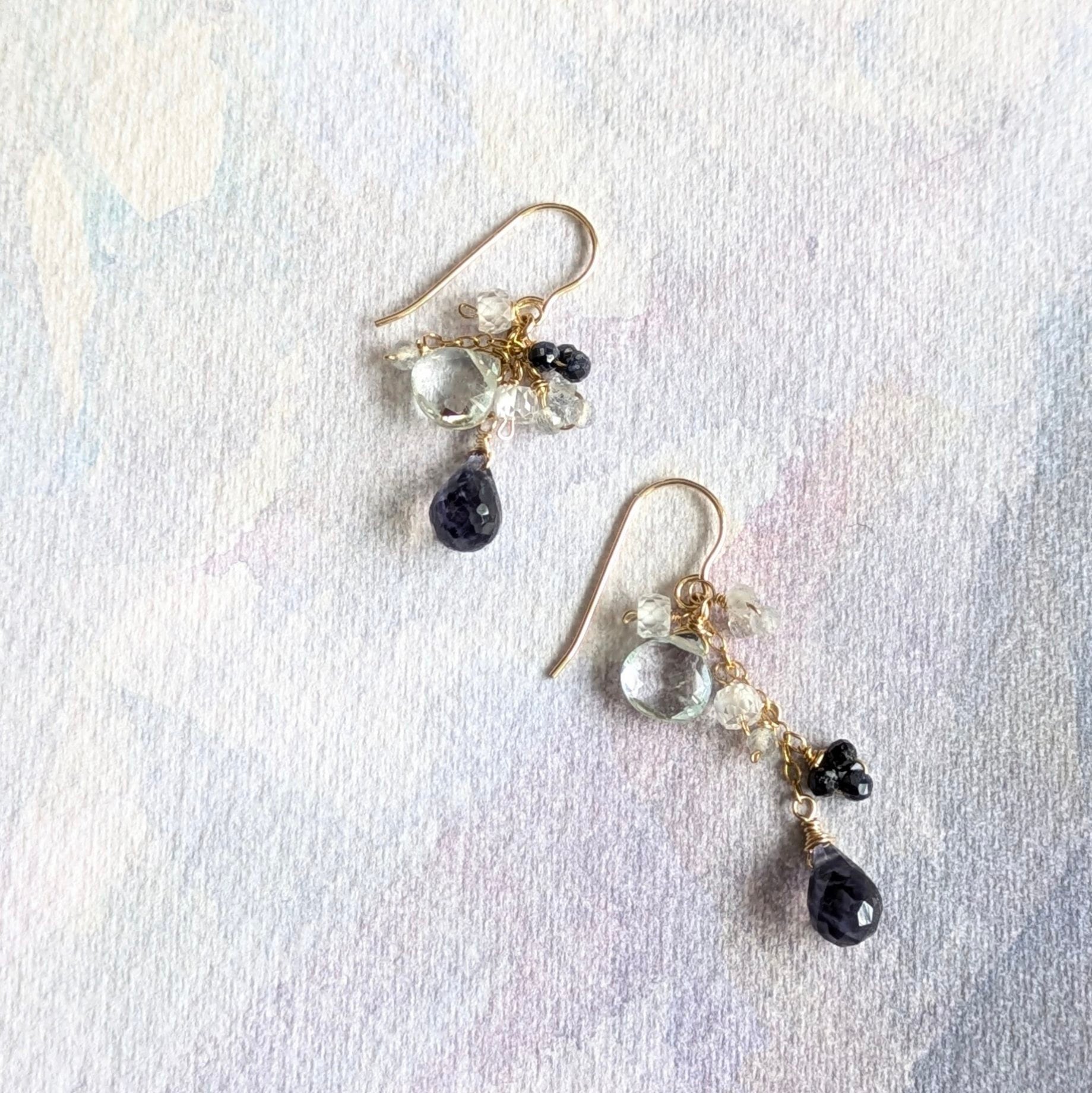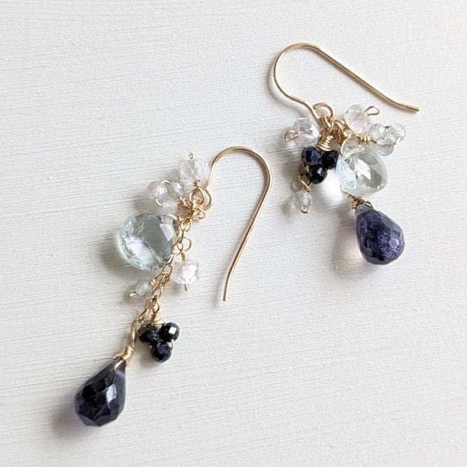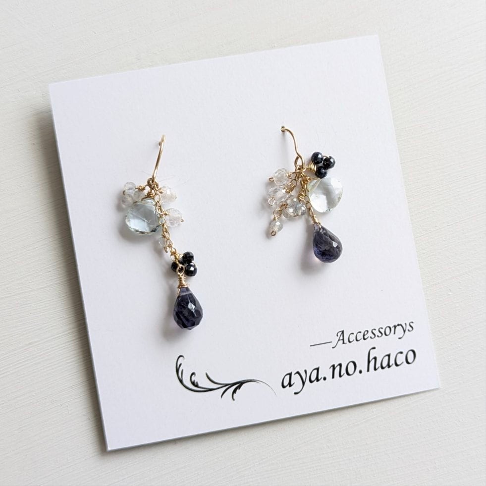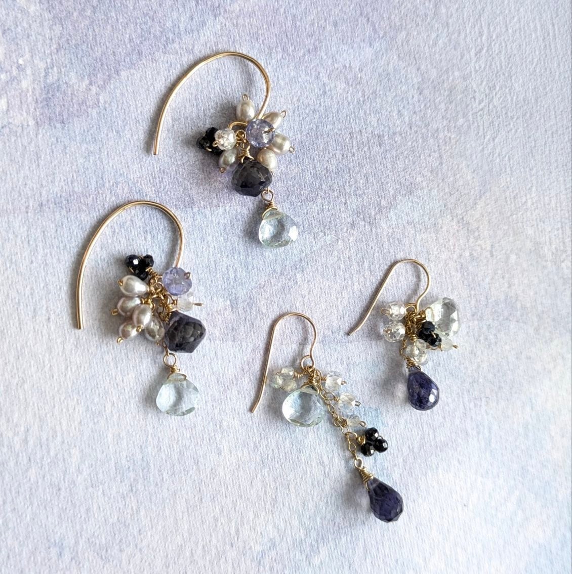 アイオライトの深みのある青紫がさりげないアクセントとなり、天然ジルコン、サファイア、ラブラドライトとともに、耳元に静かに揺れる青のグラデーションを描きます。