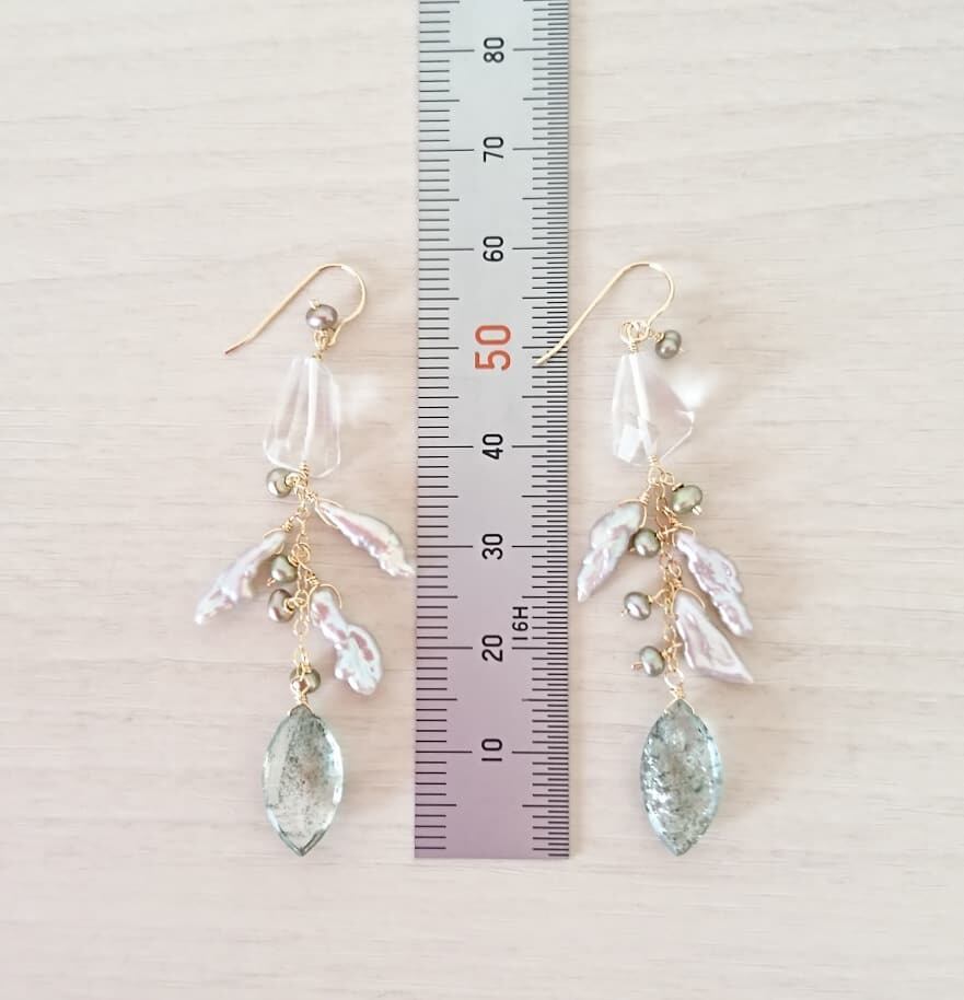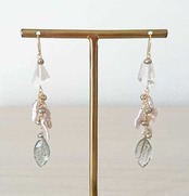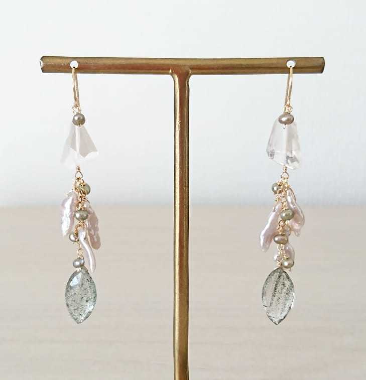 クリスタルのラフカットと淡水グレー染めケシパールにグリーンカラーのガーデンクォーツ。