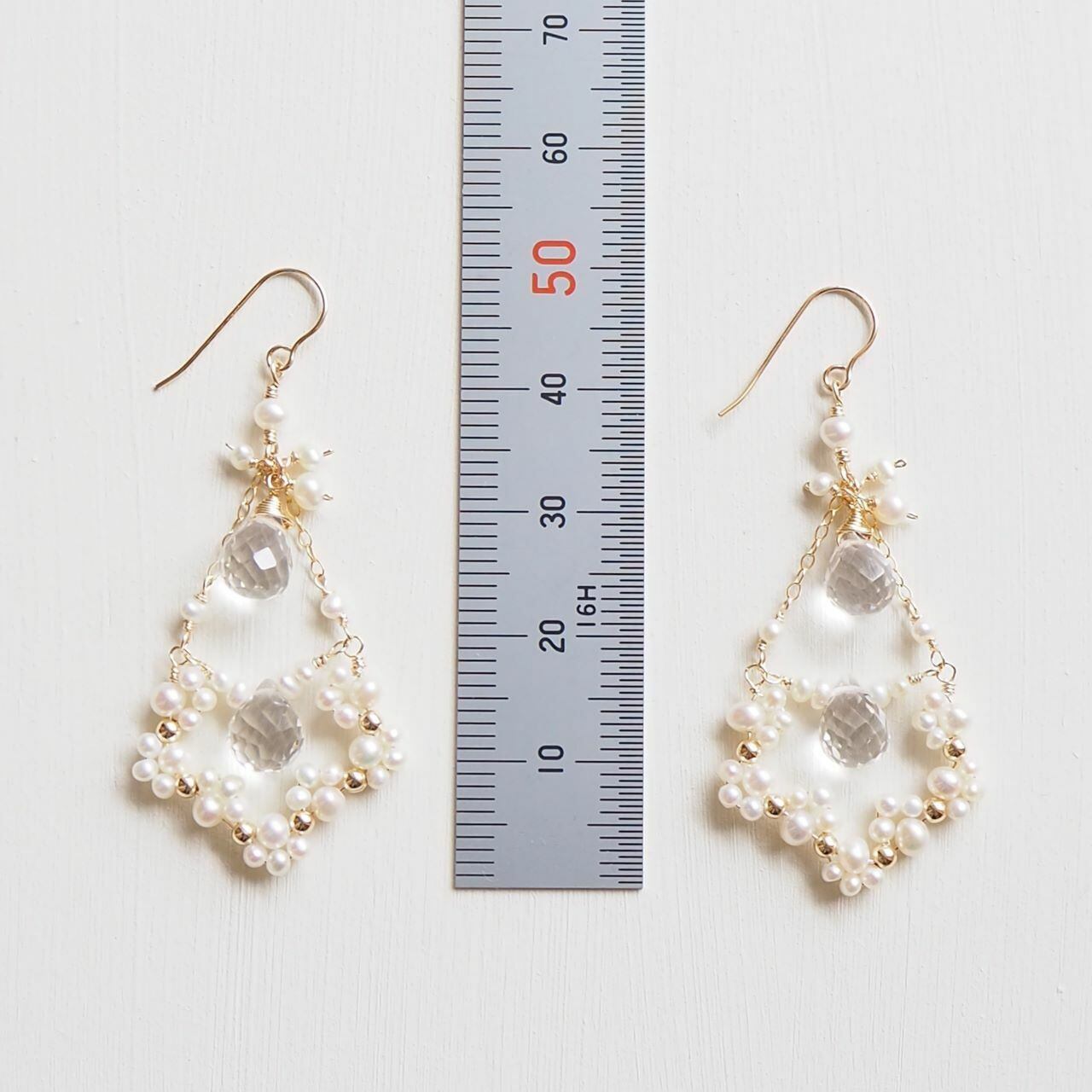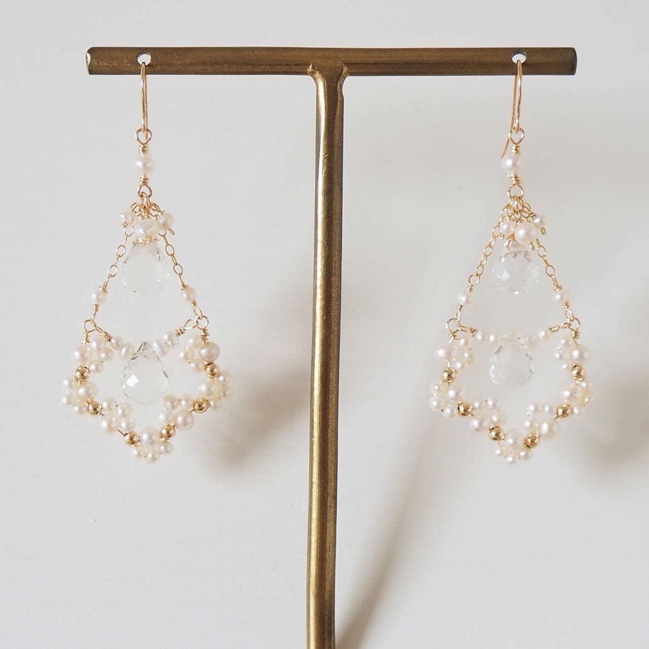 1㎜、2㎜の淡水ベビーパールと14KGFビーズを丁寧に編み、輝きが美しいプレミアムカットのクリスタルドロップを2粒使用しました。