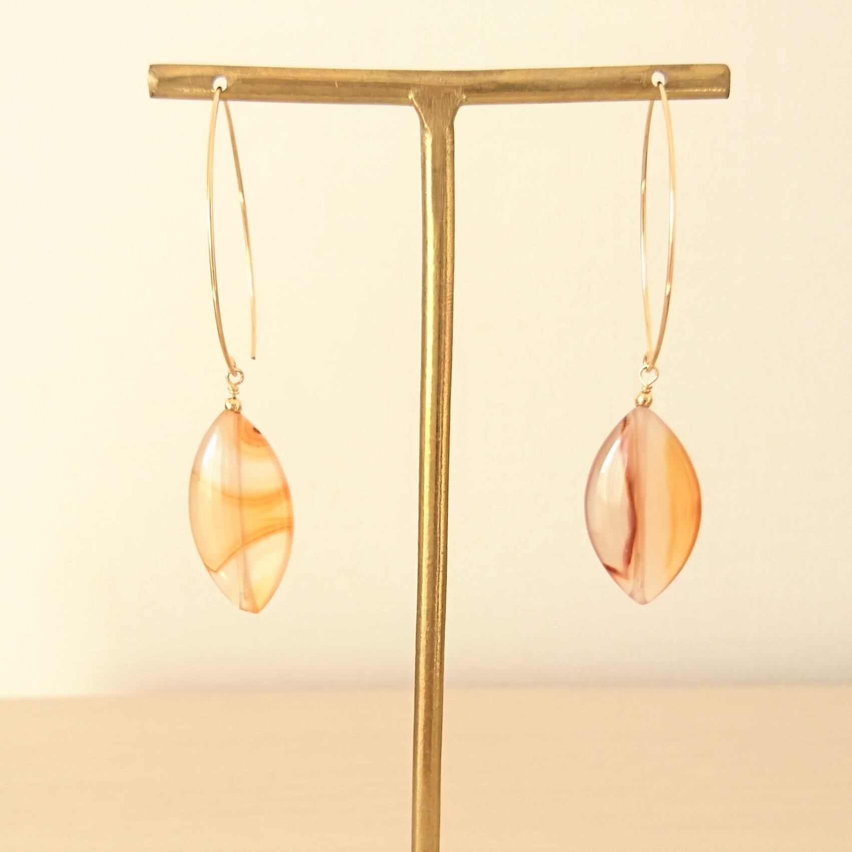 透明感のあるマーブル模様が魅力的なカーネリアンを、フープピアスのラインを柔らかなラインのマーキス型に加工したフックピアスに仕上げました。
