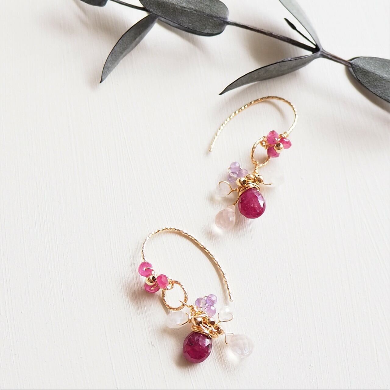 ペアシェイプカットのルビー、ドロップカットのローズクォーツに小粒ビーズを添え、ワイヤーワークで形作ったピアスです。
