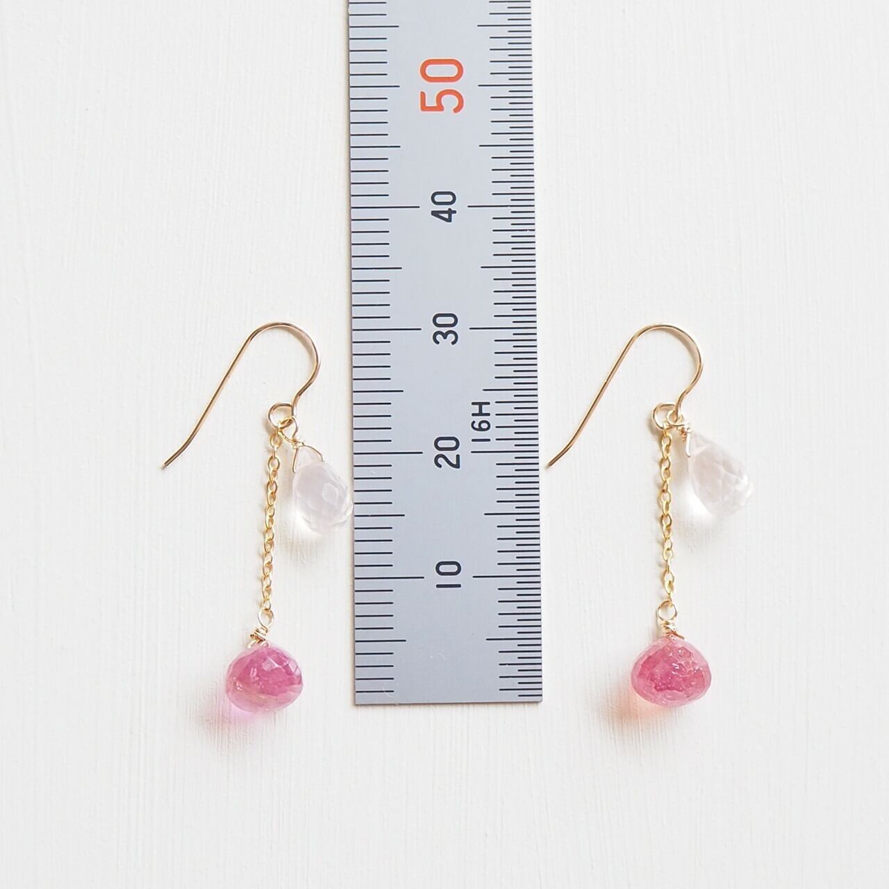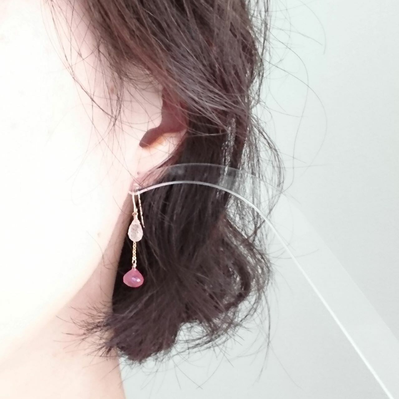 オニオンカットのピンクカラーのサファイアに優しいローズクォーツのドロップカットを合わせた上品で可愛らしいピアスです。