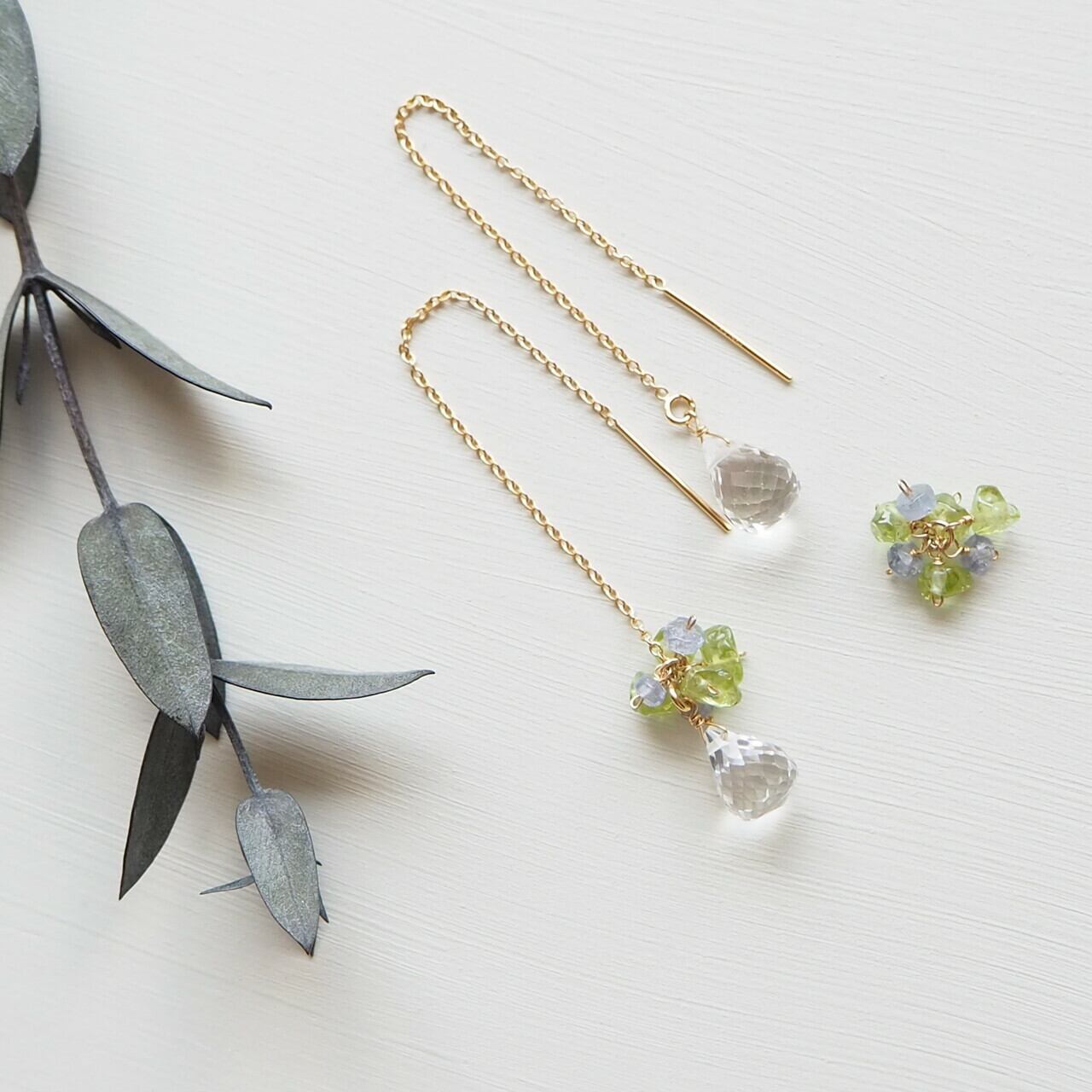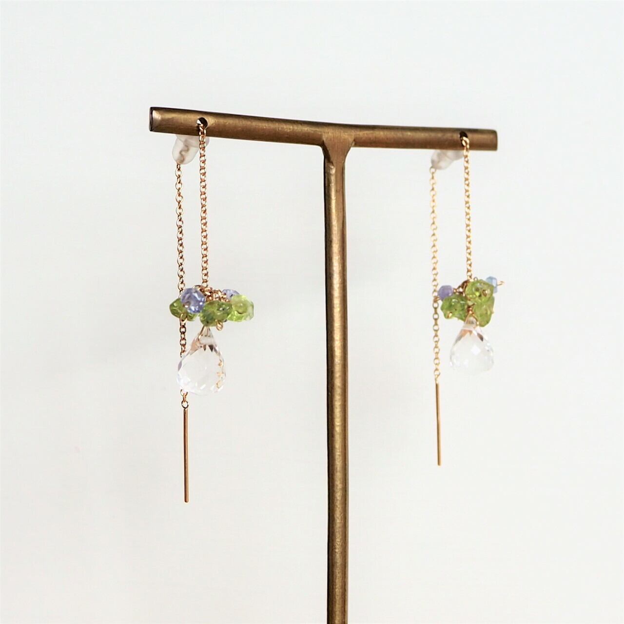 それだけではシンプルなので、ペリドットとタンザナイトのしゃらしゃらパーツをアクセントにプラスしました。