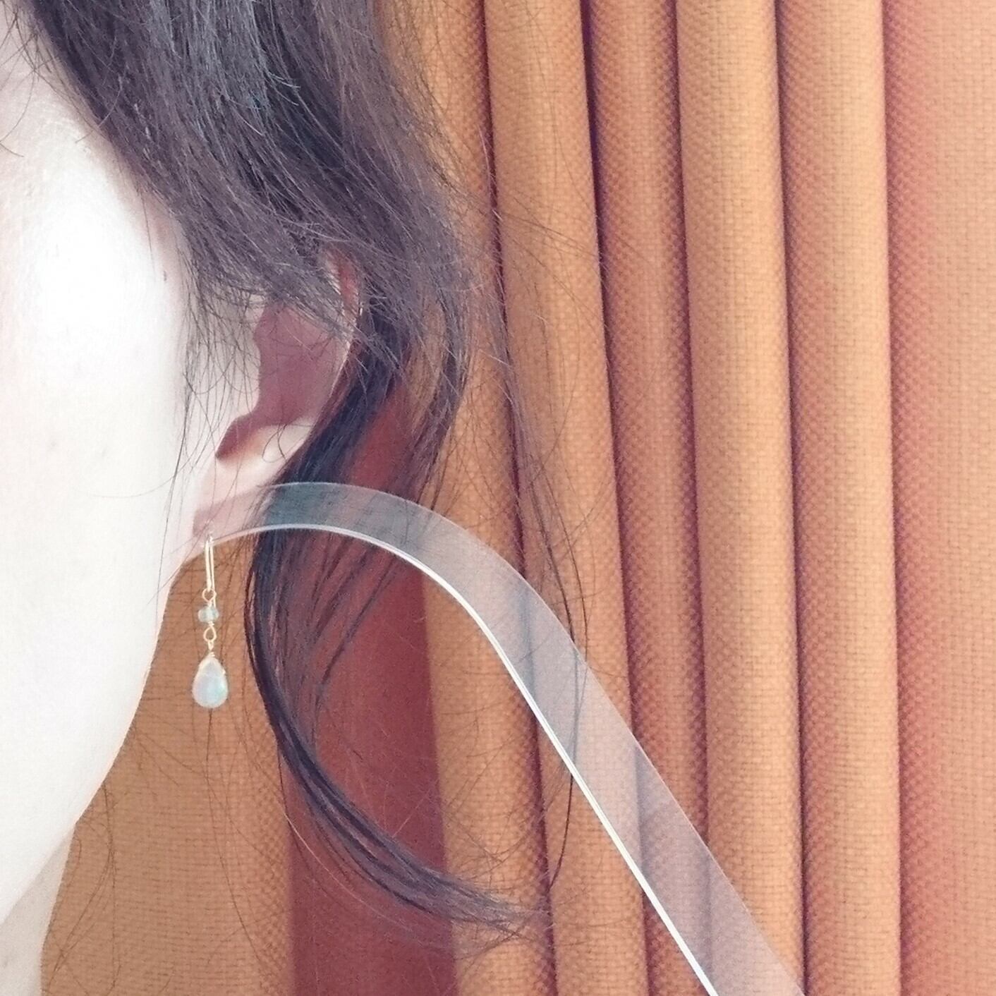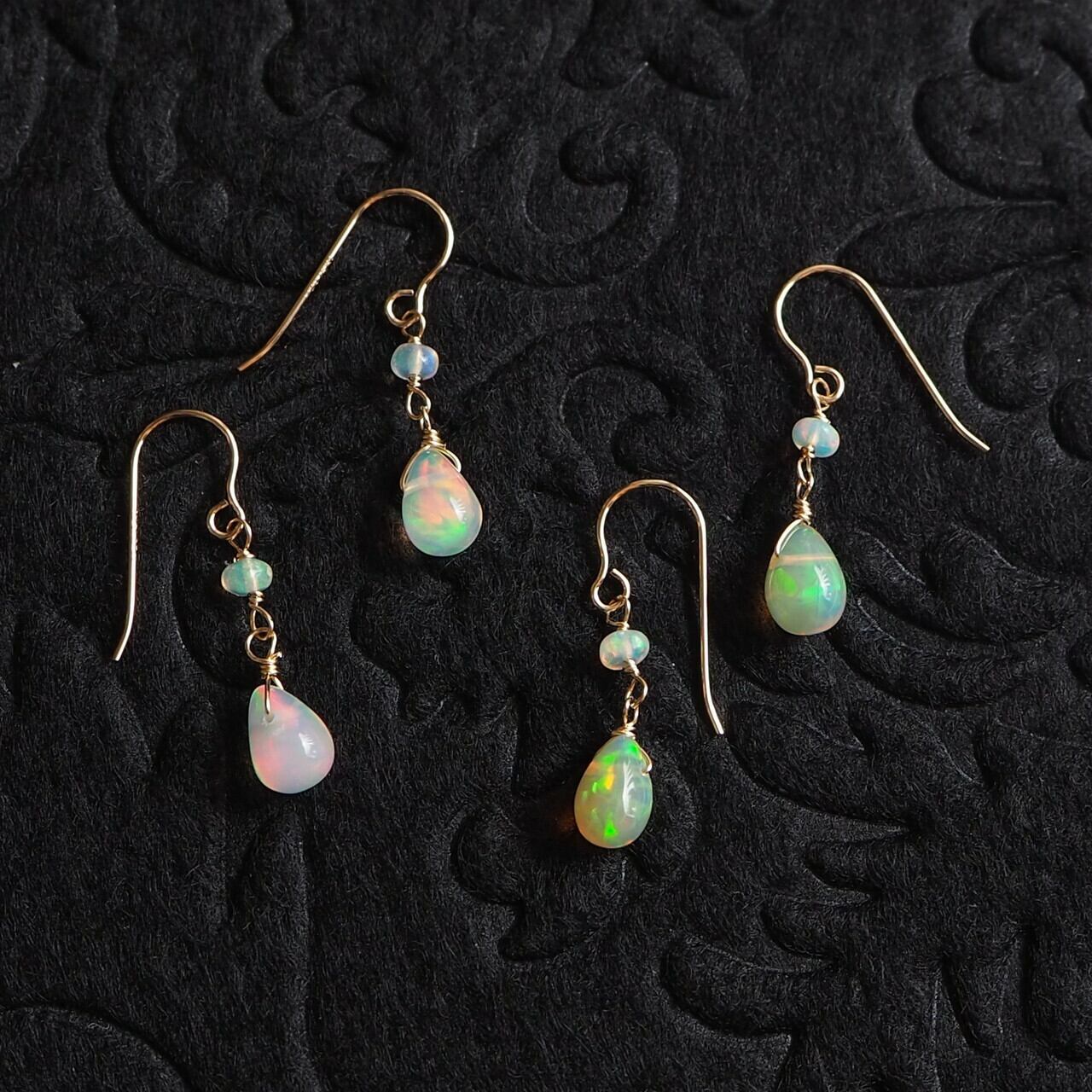 つるんとしたフォルムと遊色が美しいエチオピア産プレシャスオパールにボタンカットのオパールをプラスしたシンプルなフックピアスです。