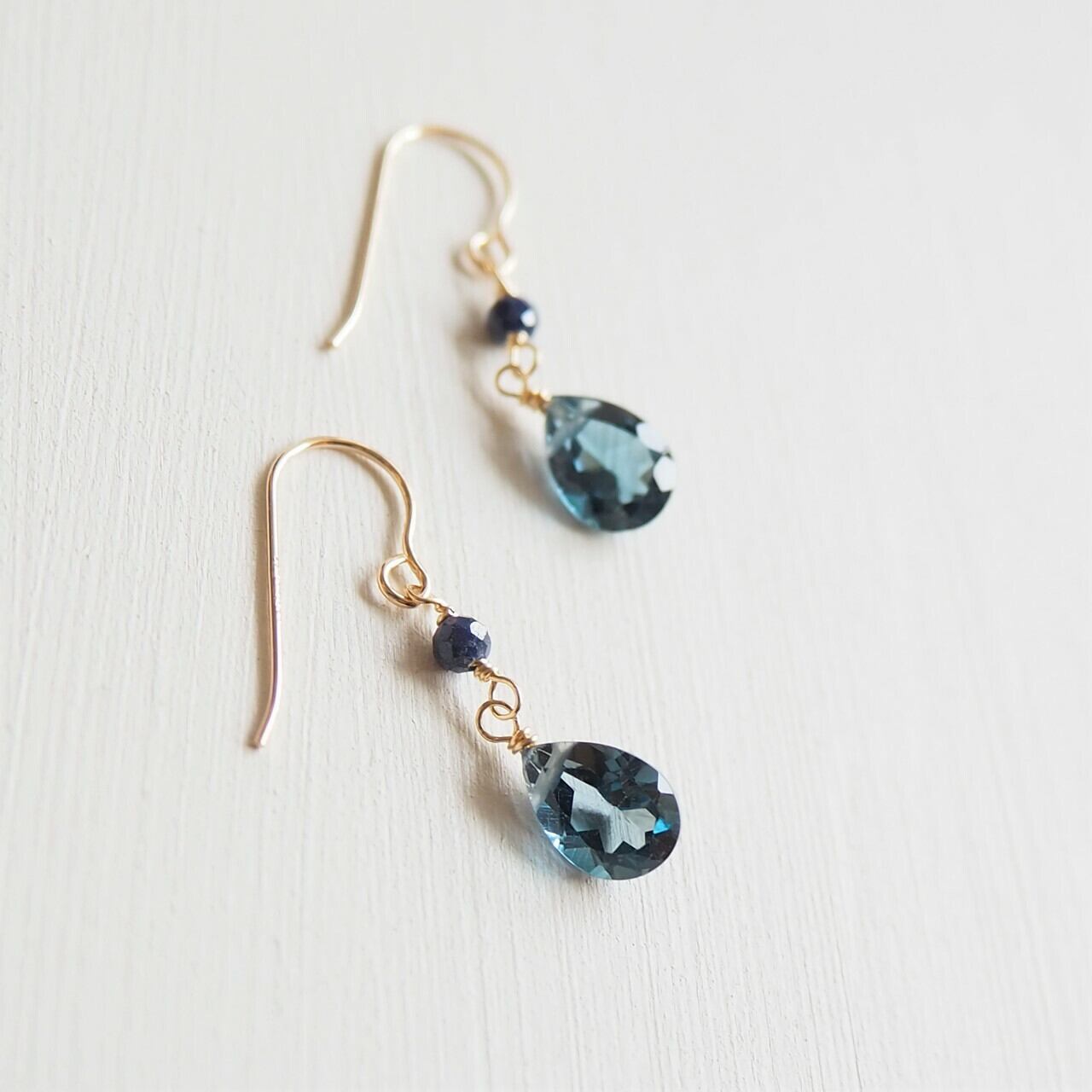 ペアシェイプファセットカットの宝石質のロンドンブルートパーズに、ぷちっとアクセントにサファイアひと粒を添えたシックなピアスです。