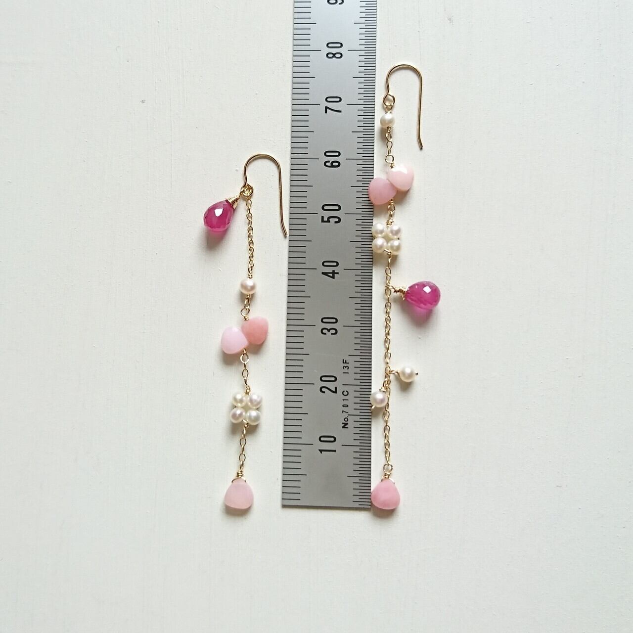 ピンクオパールフラワー&ルビーのアシンメトリーロングピアス