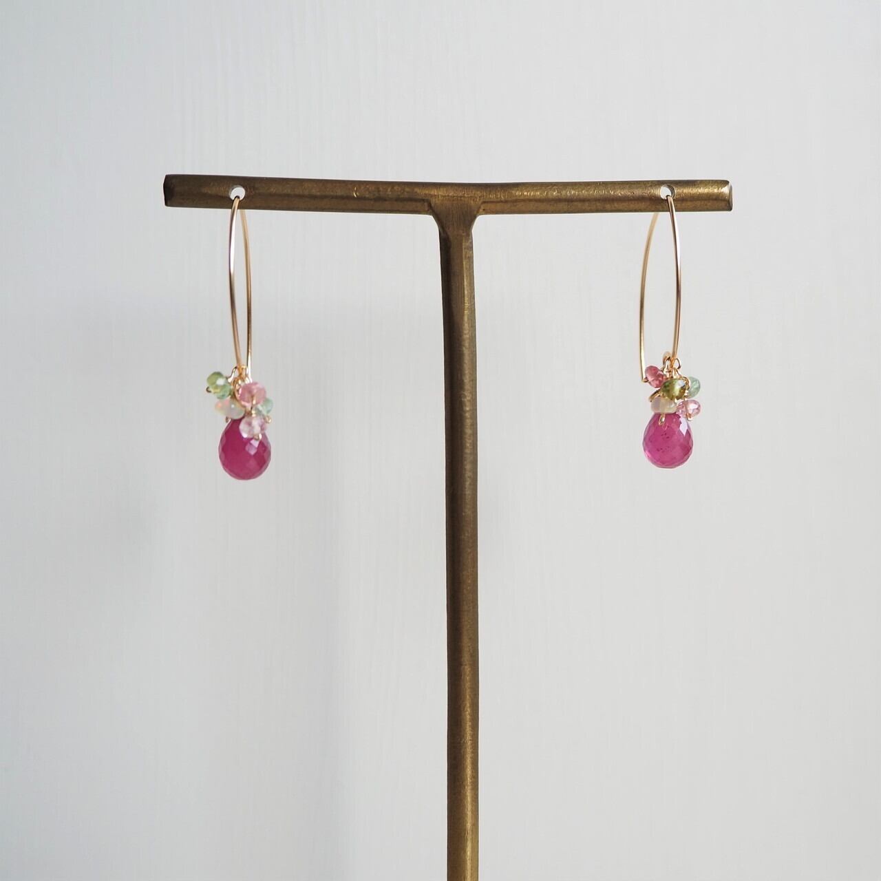 モザンビーク産の宝石質のルビードロップカットにトルマリン、オパールのチャームを添えた2WAYタイプのオリジナルマーキスフックピアス。
