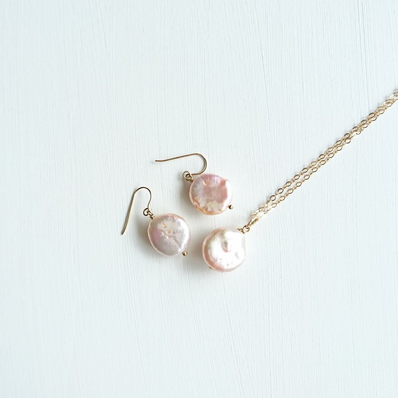 優しい淡いピンクカラーのコイン型の淡水パールを使用したチャームネックレスです。