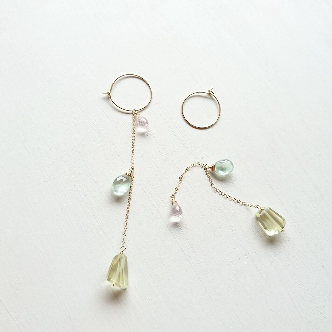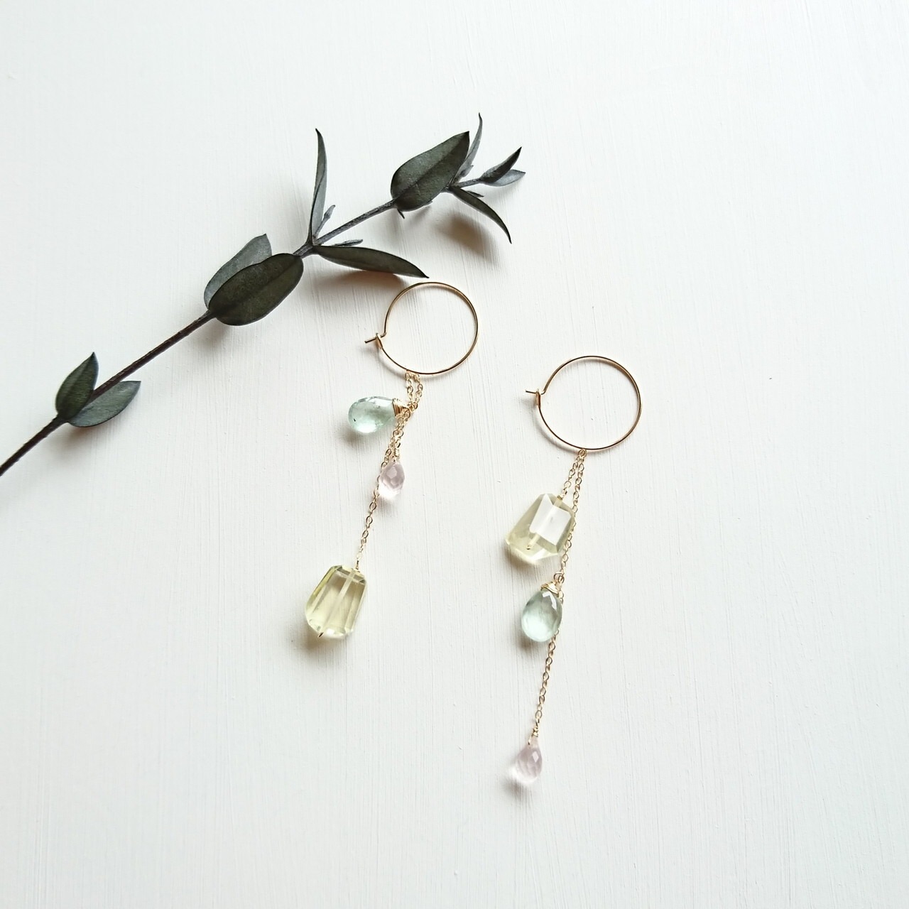 レモン&ローズクォーツ×アクアマリンのアレンジフープピアス