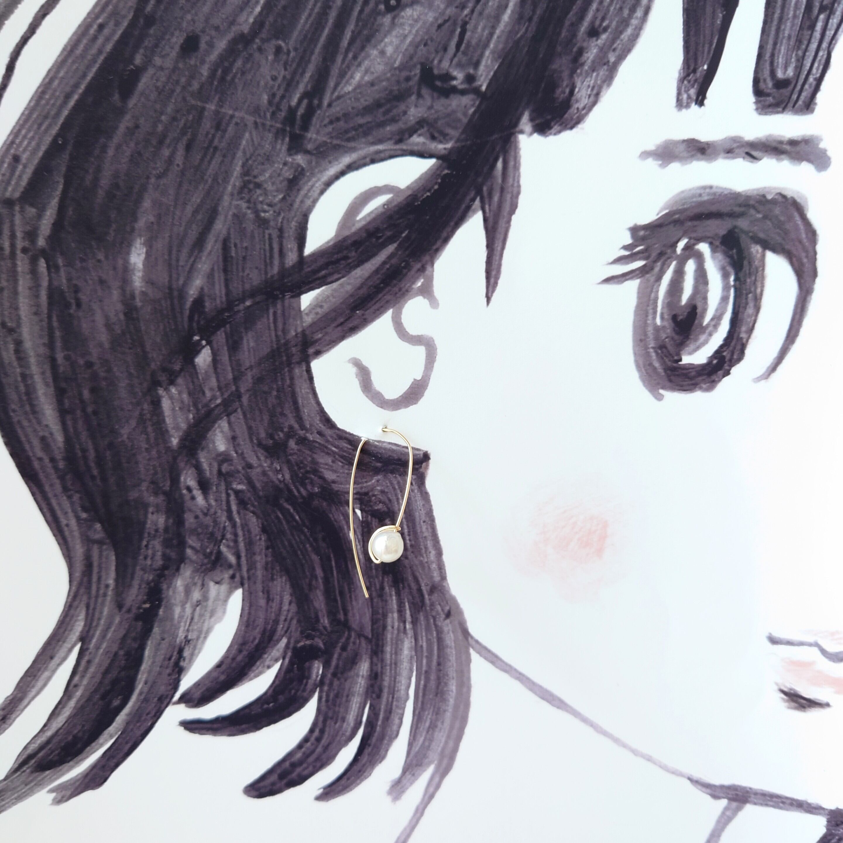 流れる様なラインが魅力的なワイヤーピアスにホワイトの淡水パールをひと粒。
