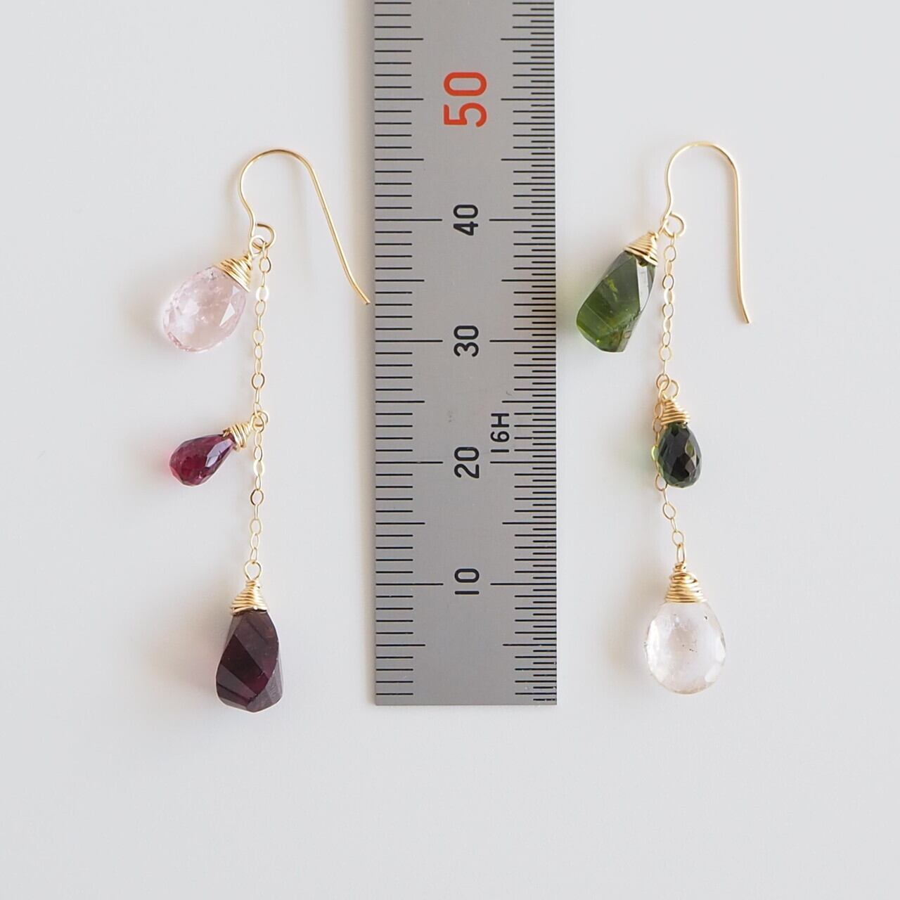 大粒のトルマリンの希少な4面ツイストカットと、透明に近い薄いピンクのトルマリンのペアシェイプカット、小さなドロップカット、色々な形のトルマリンを使用した大人可愛いデザインのピアスです。