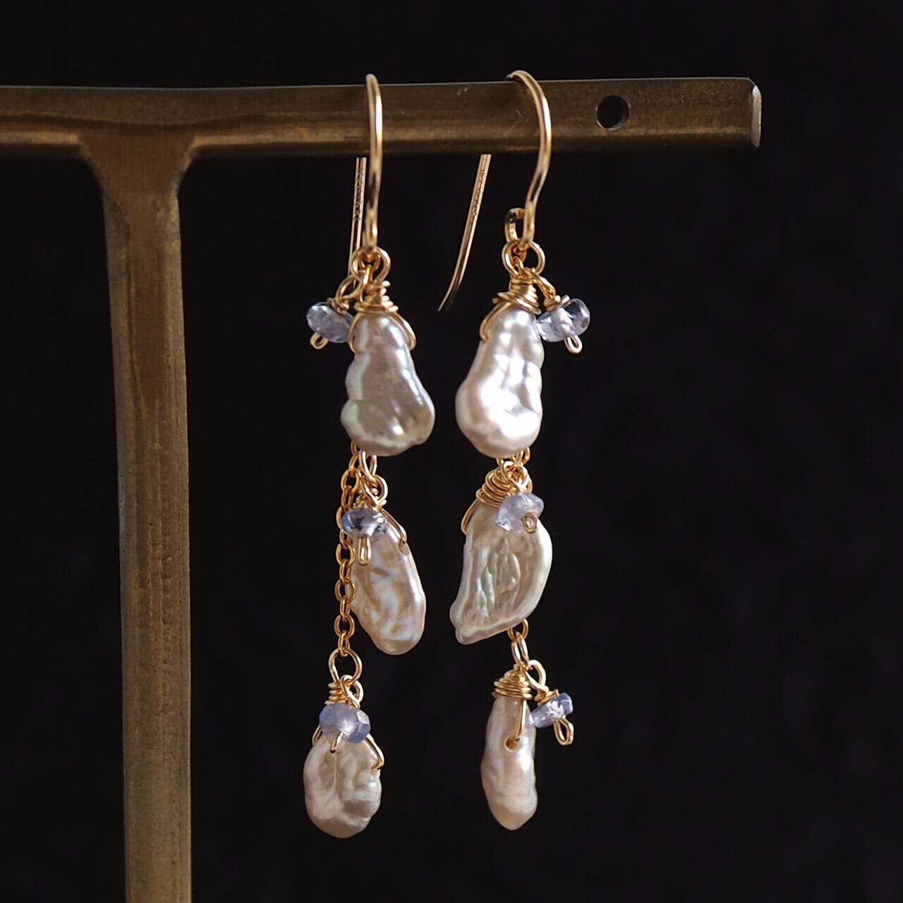 ひとつひとつ変化があって可愛らしい花びらの様なフォルムのケシパールを3つ、縦のラインのスッキとしたチェーンピアスに仕上げました。