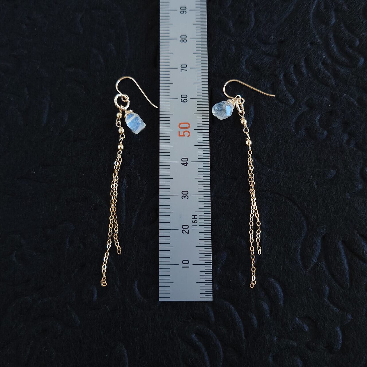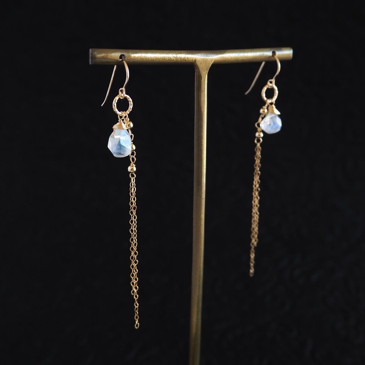 ツイストドロップカットのシラーの美しいレインボームーンストーンにゴールド(14KGF)のパーツとチェーンの輝きを添えたシックなデザインピアスです。