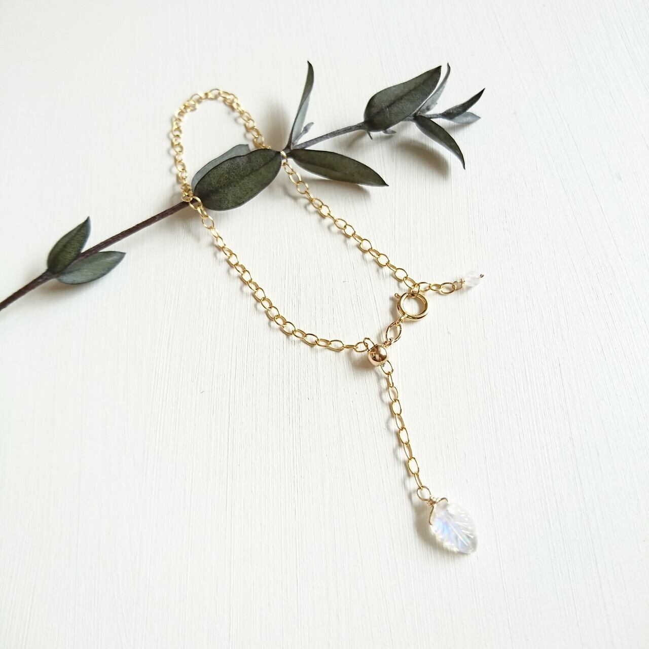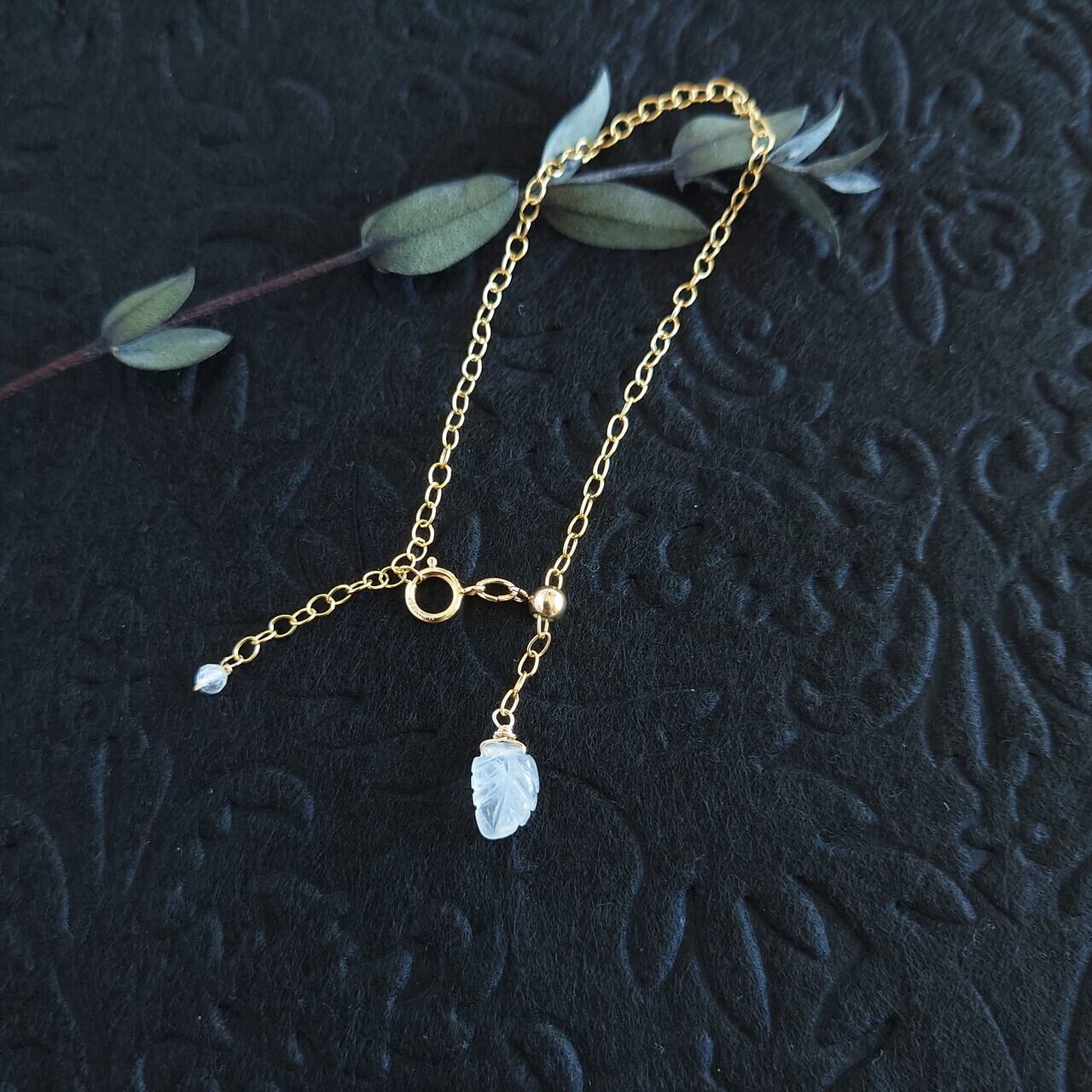 綺麗なカービングが施されたリーフカットのレインボームーンストーンをアクセントに、スライドして長さを調整できるチェーンブレスレットを作りました。