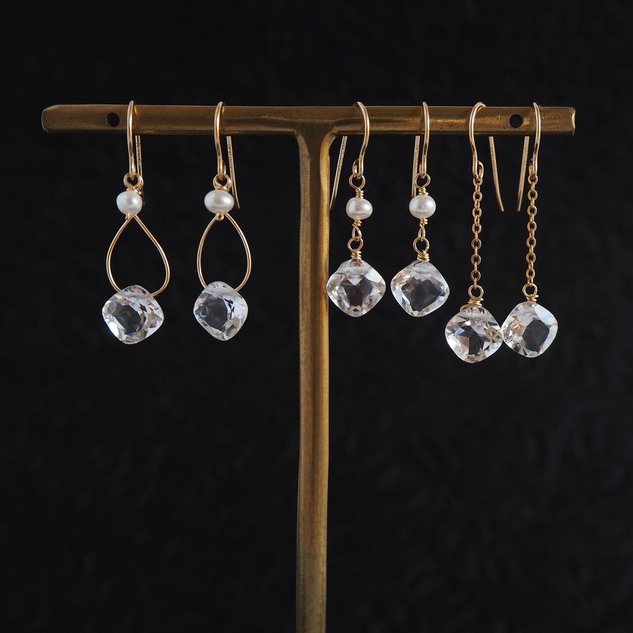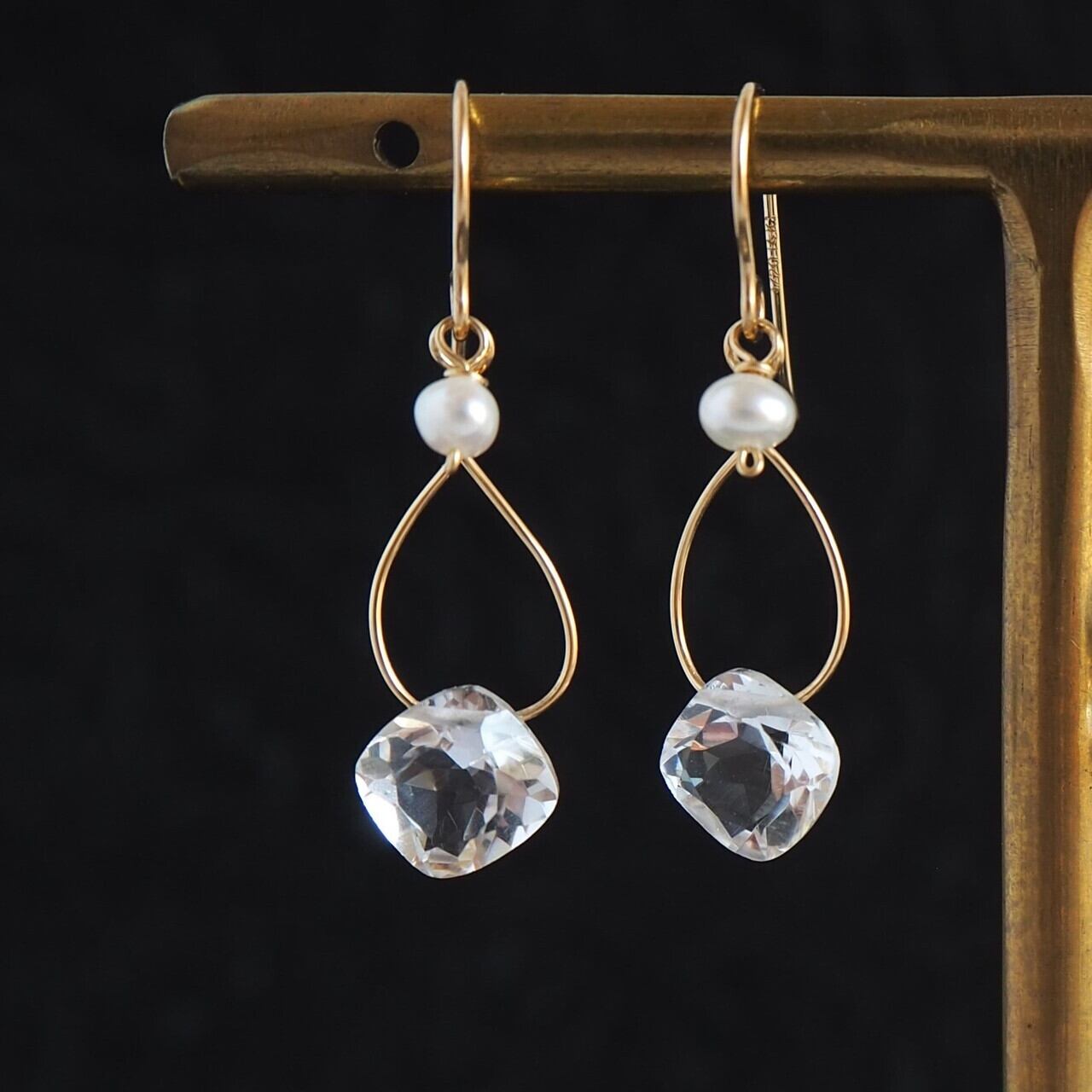 スクエアクリスタルのワイヤープチパールピアス