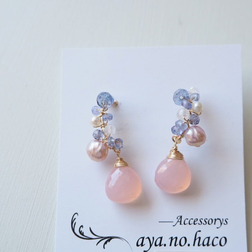 ブルー系のタンザナイト、アイオライトをアクセントに、ピンクグレーの淡水ケシパール、ホワイトパール、レインボームーンストーンを添えました。