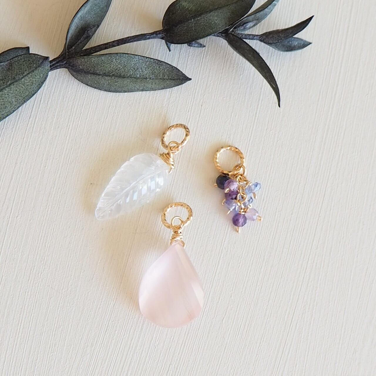 彩りを添える、タンザナイト、アメジスト、サファイアの小粒チャーム。