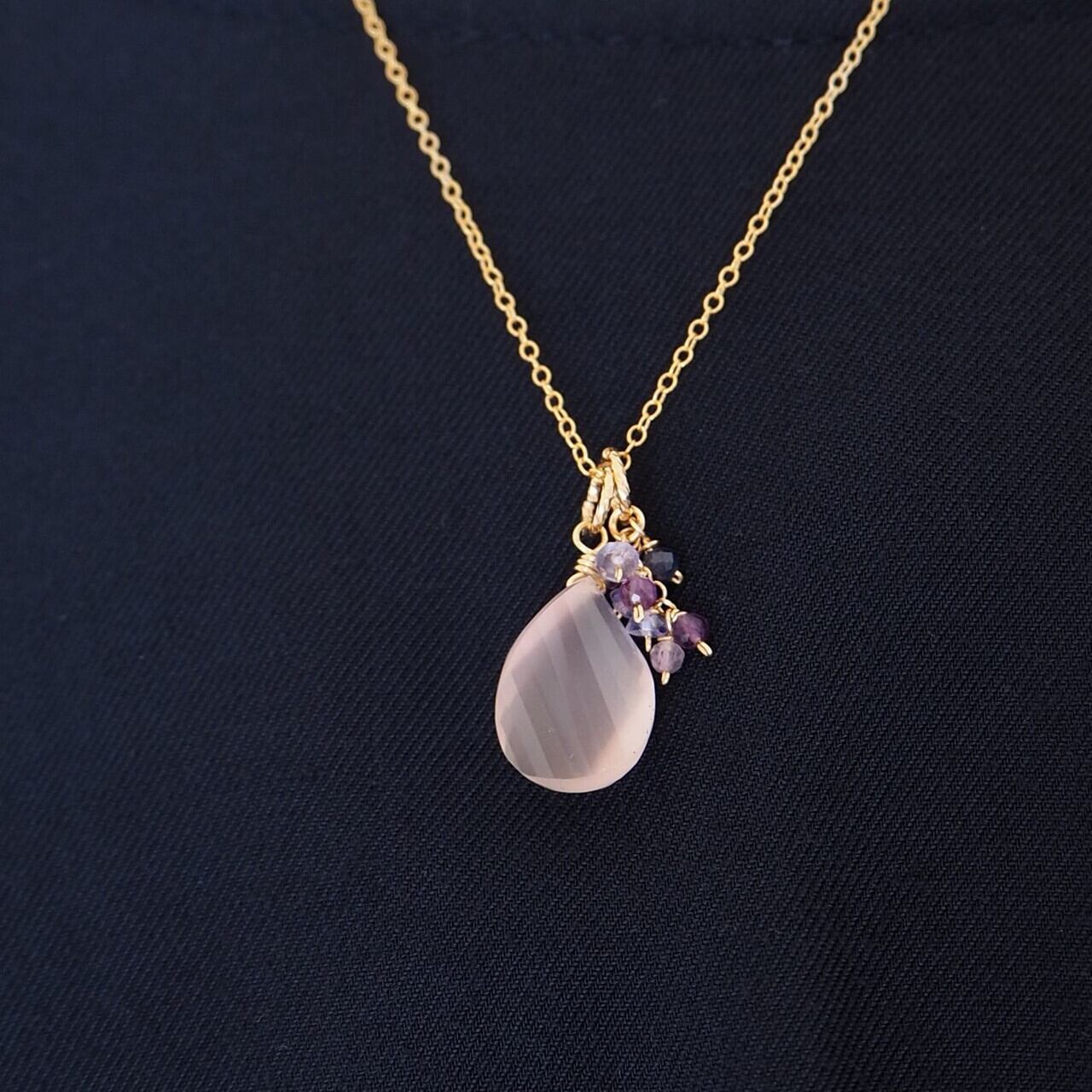 ツイストしたペアシェイプの繊細なカットが美しいローズクォーツのひと粒チャーム。