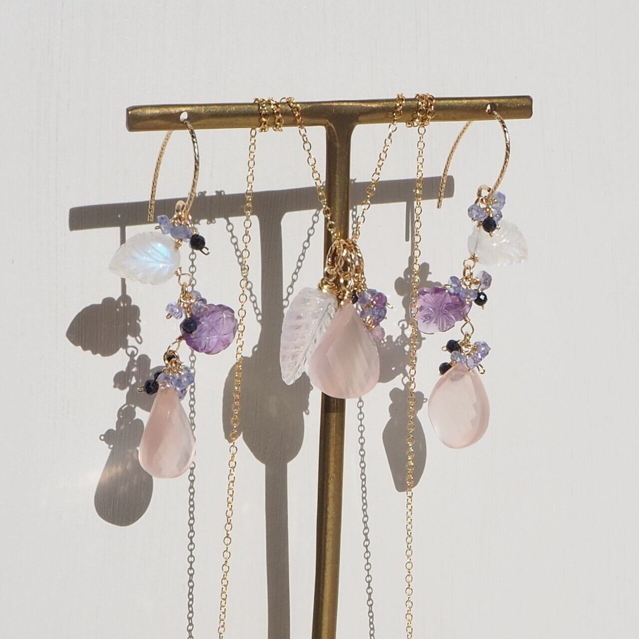 優しいカラーのアクセントにフラワーカービングのアメジスト。