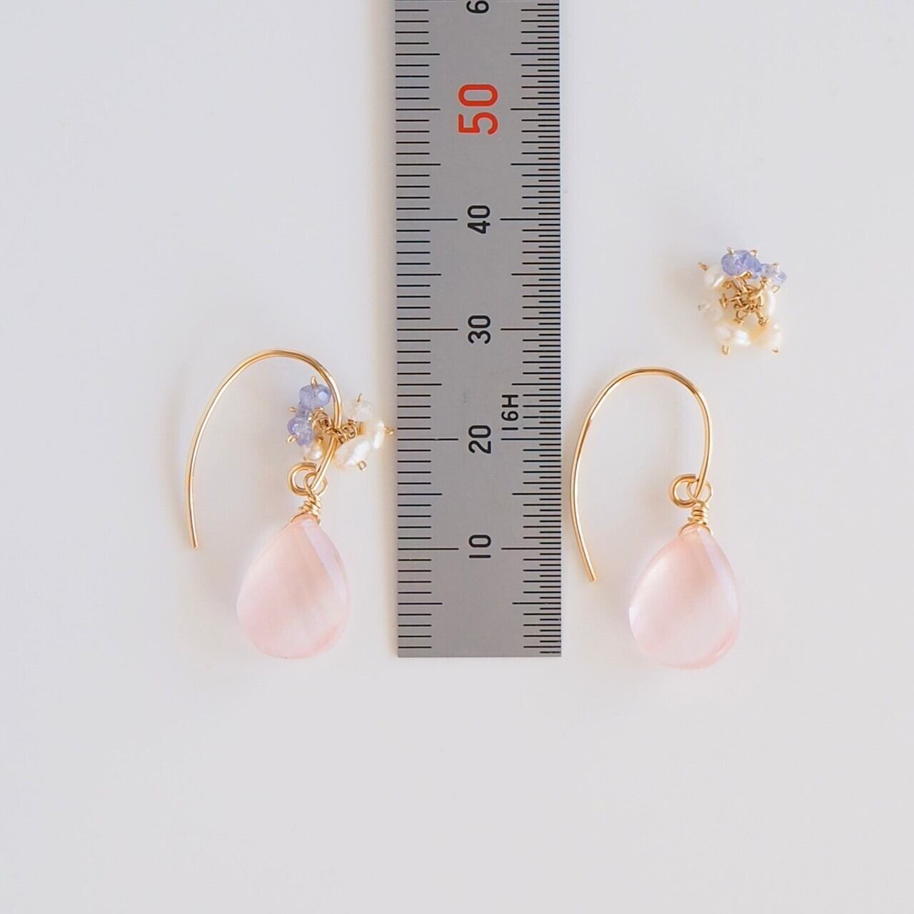 ツイストしたペアシェイプの繊細なカットが美しいローズクォーツのひと粒ピアスに、取り外し可能なしゃらしゃらチャームを添えた2WAYタイプのフックピアスです。