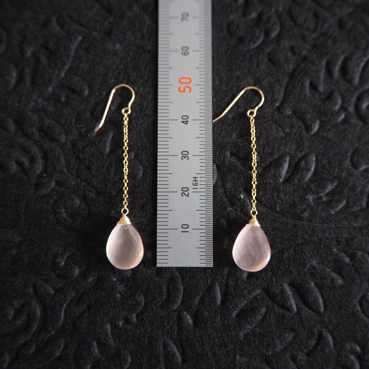 ツイストしたペアシェイプの繊細なカットが美しいローズクォーツをシンプルなチェーンピアスに仕上げました。