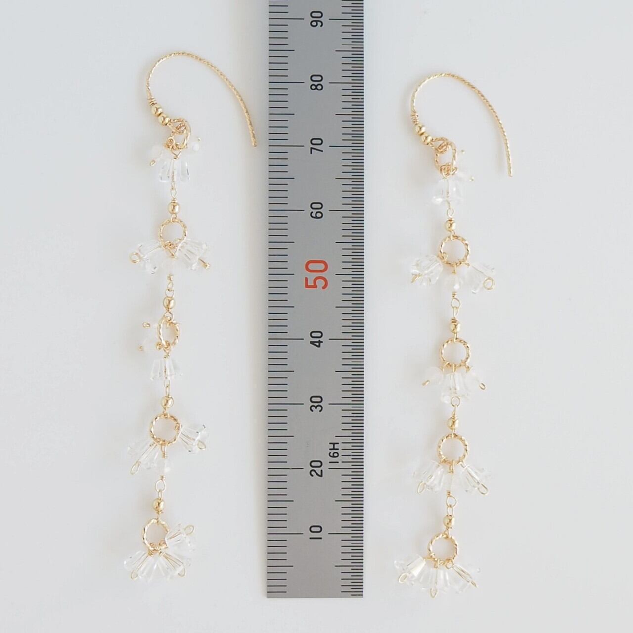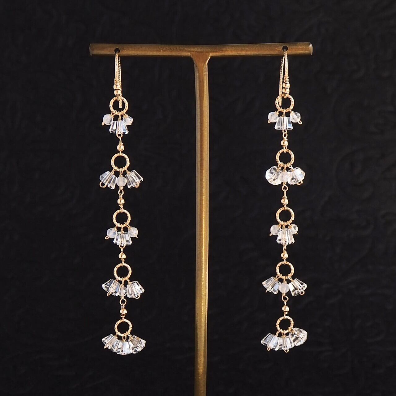 グリッターサークルをアクセントに、レインボームーンストーンと14KGFビーズをプラスして、しゃらしゃらと華やかだけど軽くて繊細なラインのロングピアスにしました。