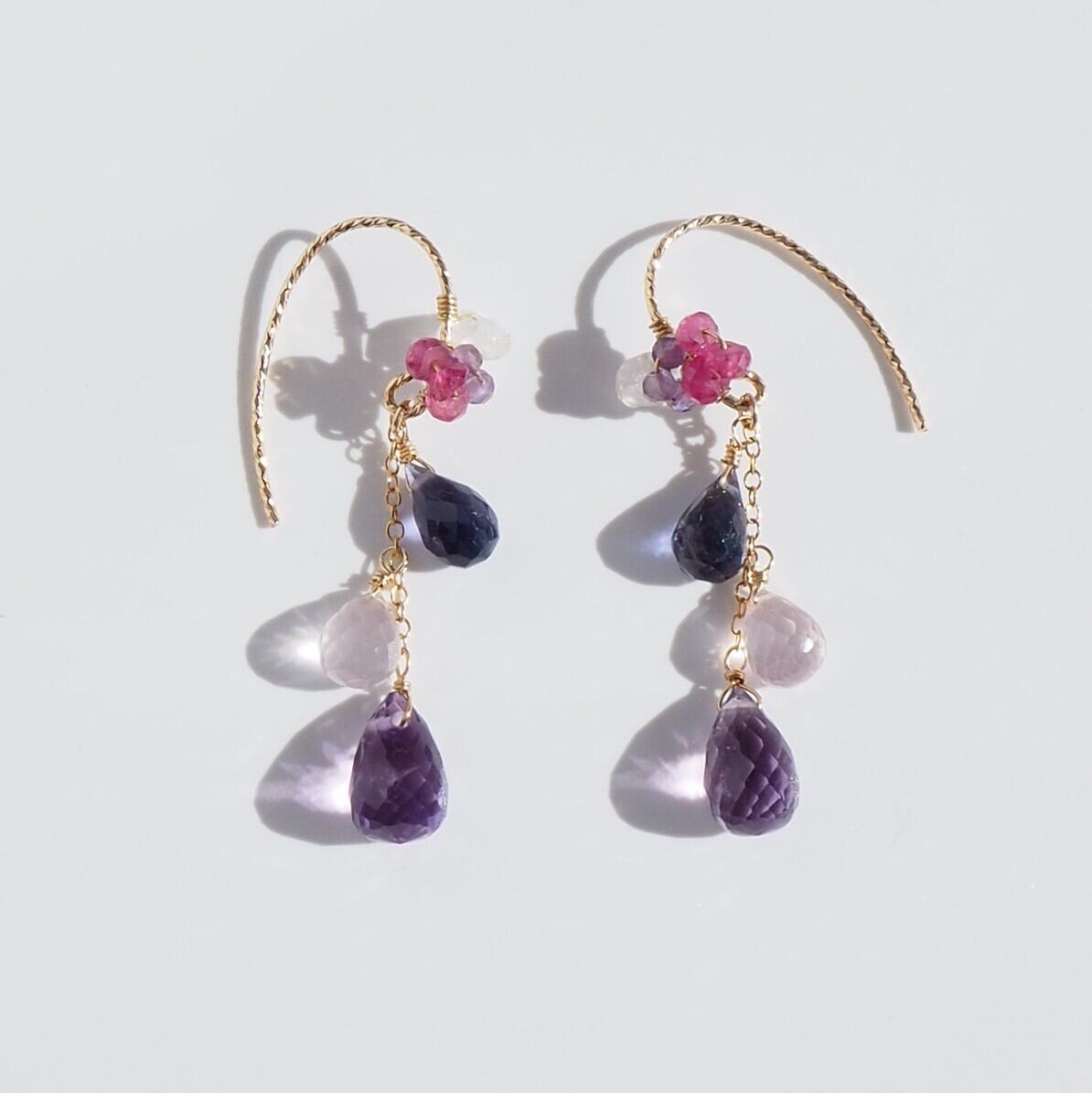 ムーンストーン、ルビー、アメジストで彩りを添えた華やかなグリッターフックピアスで、春らしく、上品な可愛らしさのあるピアスに仕上がりました。