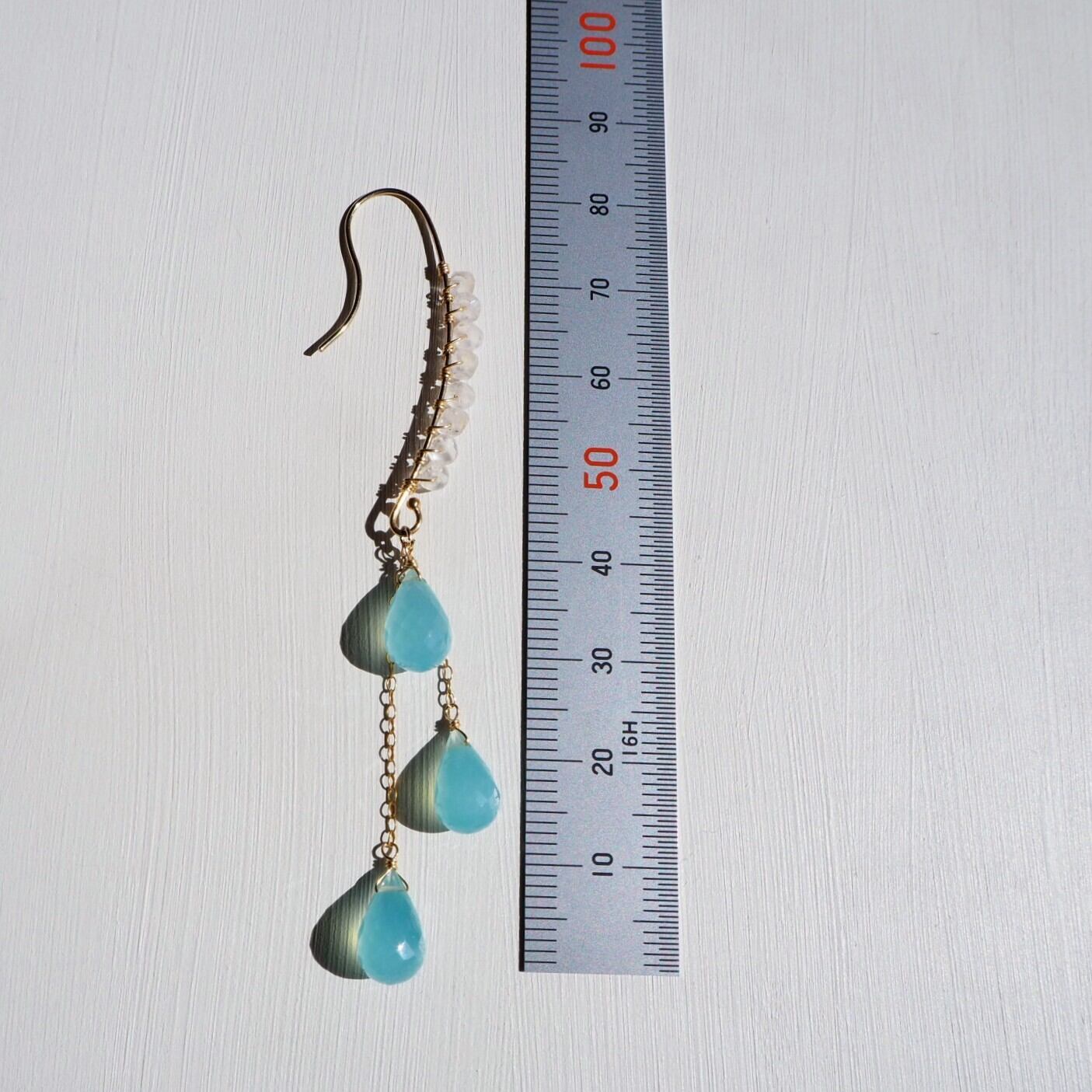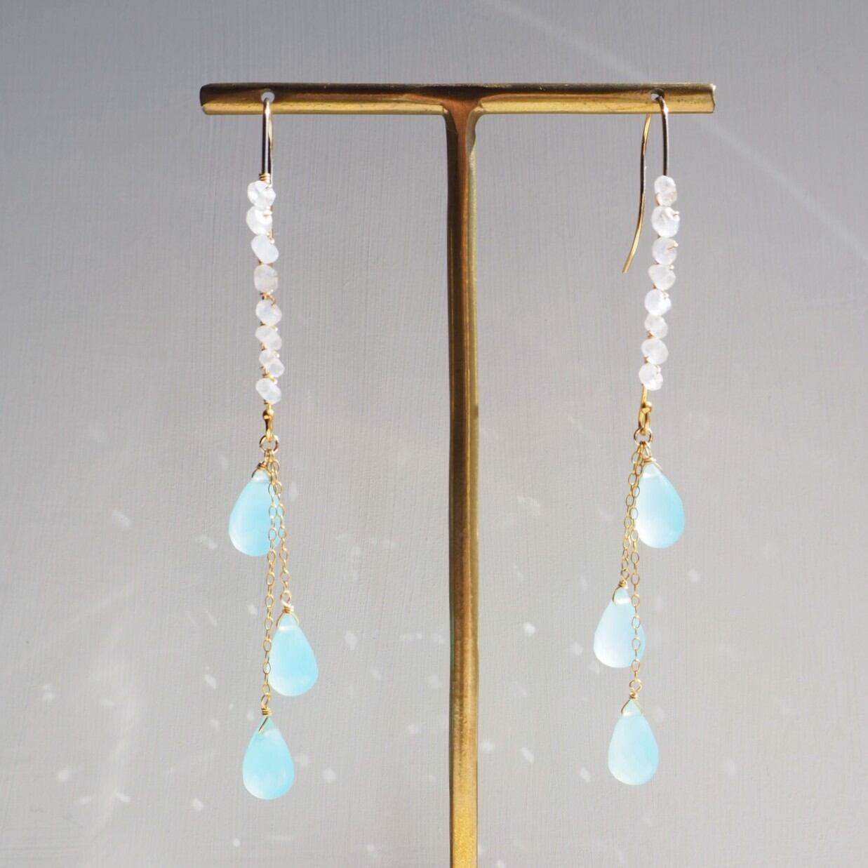 繊細なドロップカットが美しいシーブルーカルセドニーを、レインボームーンストーンのロングフックに3粒。