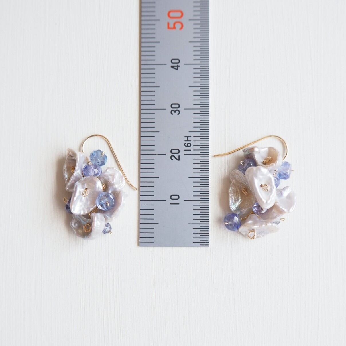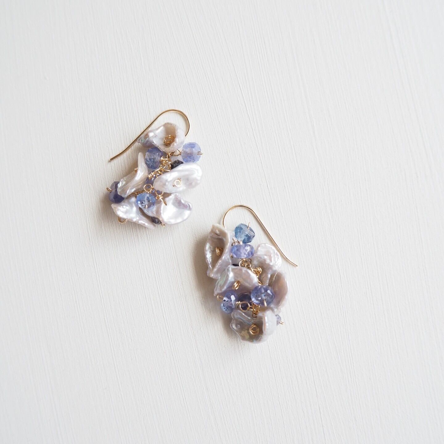 お花の様に繊細で可憐な淡いシルバーグレーの淡水ケシパールに、タンザナイト、アイオライトのブルーの美しい輝きを添えた上品なピアスです。