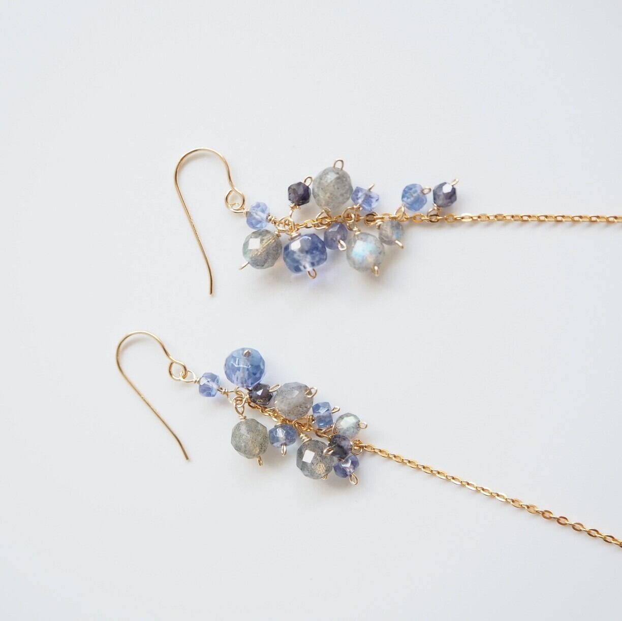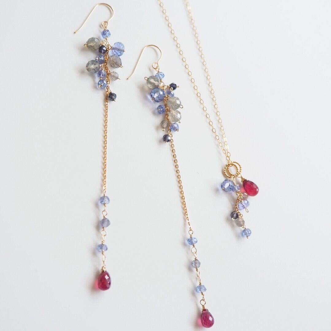 上部のしゃらしゃら部分は、ルビーが映えるようにラブラドライト、アイオライト、タンザナイトを使用し、色味をシックにまとめました。
