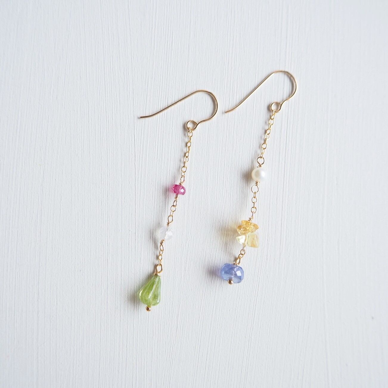 華奢なラインのチェーンピアスを、左右異なる天然石を使用し、アシンメトリーで遊び心のあるデザインに仕上げました。