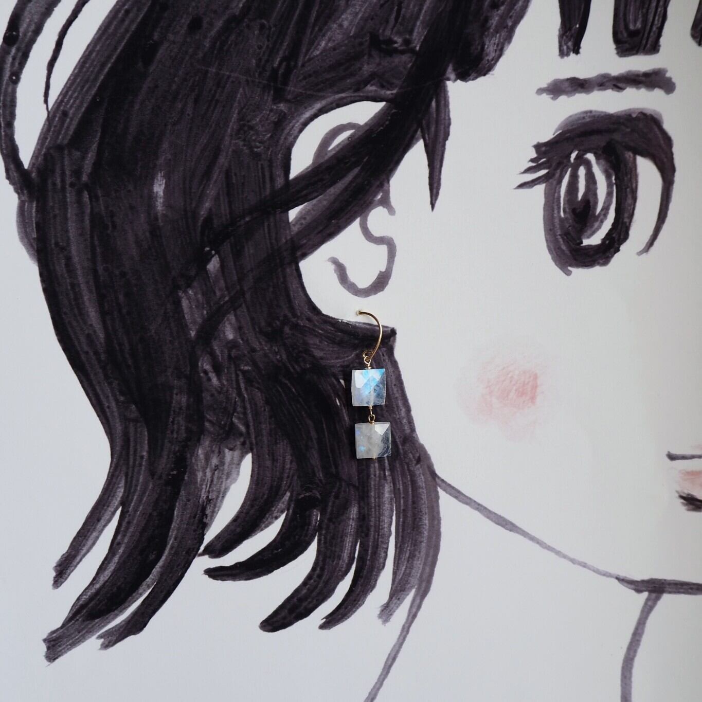 ブルーシラー多めのレインボームーンストーンが、光を受け耳元で神秘的に輝きます。