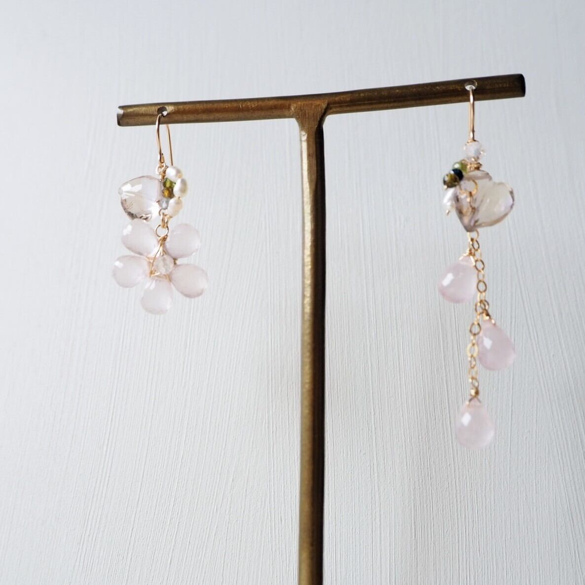 透明感があり、繊細なカットが美しいローズクォーツを贅沢に使用し、アシンメトリーに仕上げた個性豊かなピアスです。