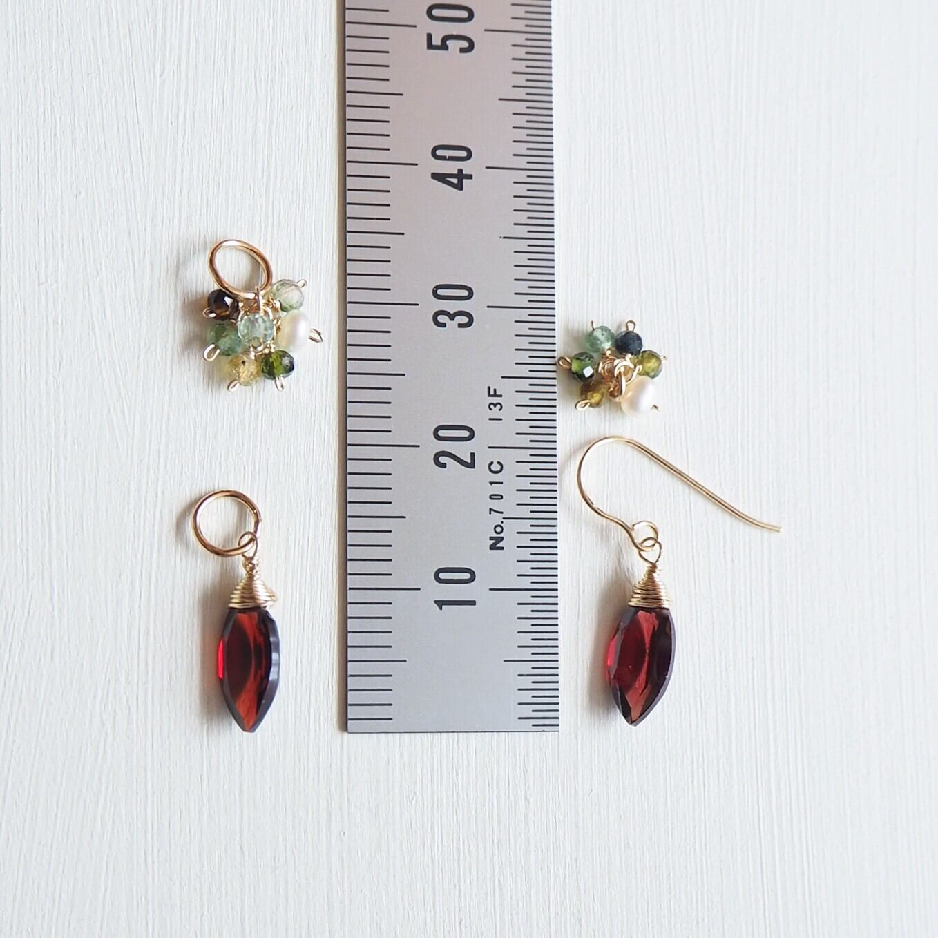 美しい深紅のガーネットのひと粒ピアスに、グリーン系のトルマリンと淡水パールの小粒チャームを添え、2wayでお使い頂けるネックレス用のチャームセットです。