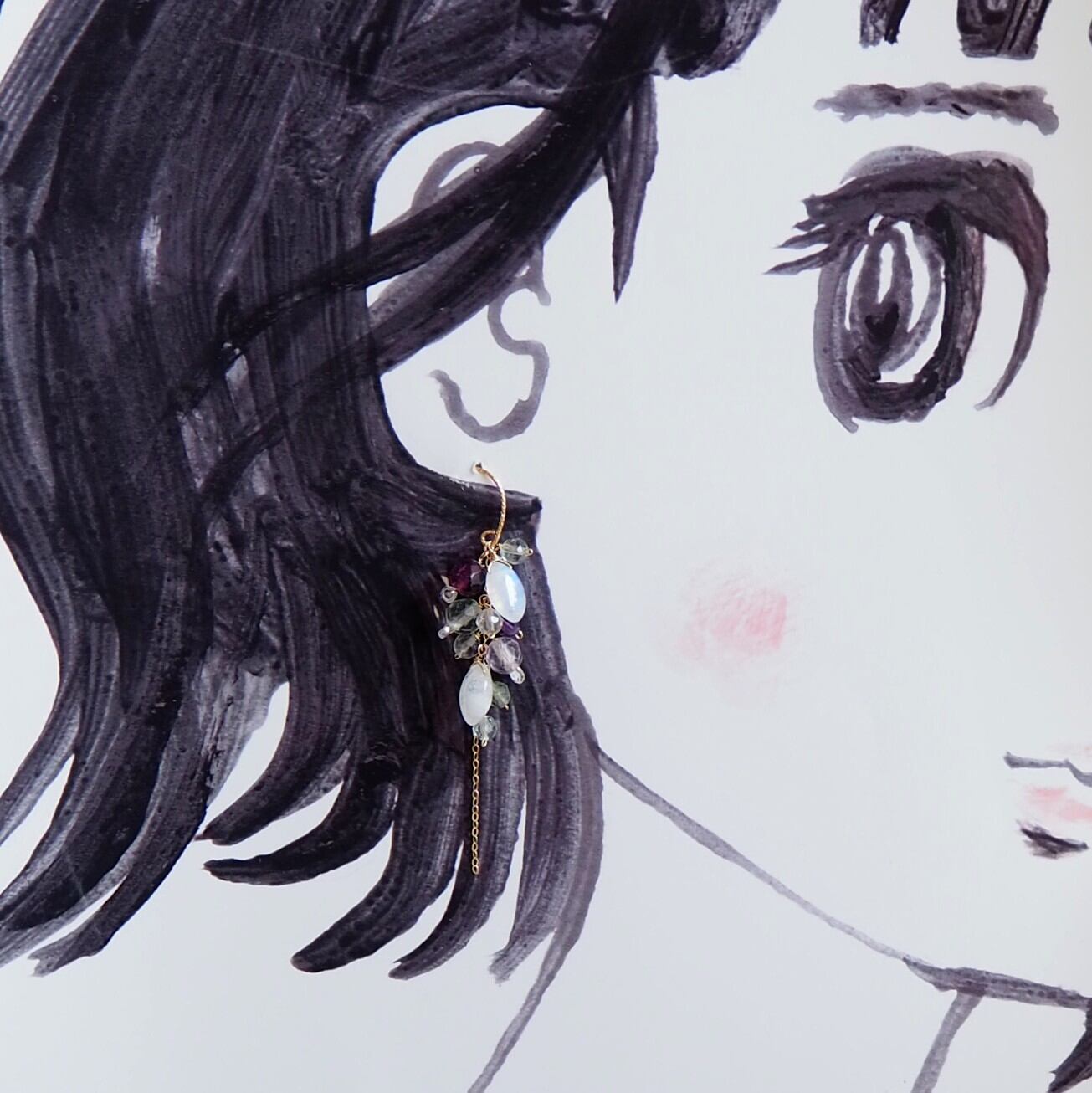 つるんとしたマーキスのレインボームーンストーンに、紫陽花の様な繊細で美しいニュアンスカラーのフローライトを合わせたとても涼しげで優しい色合わせのピアスです。