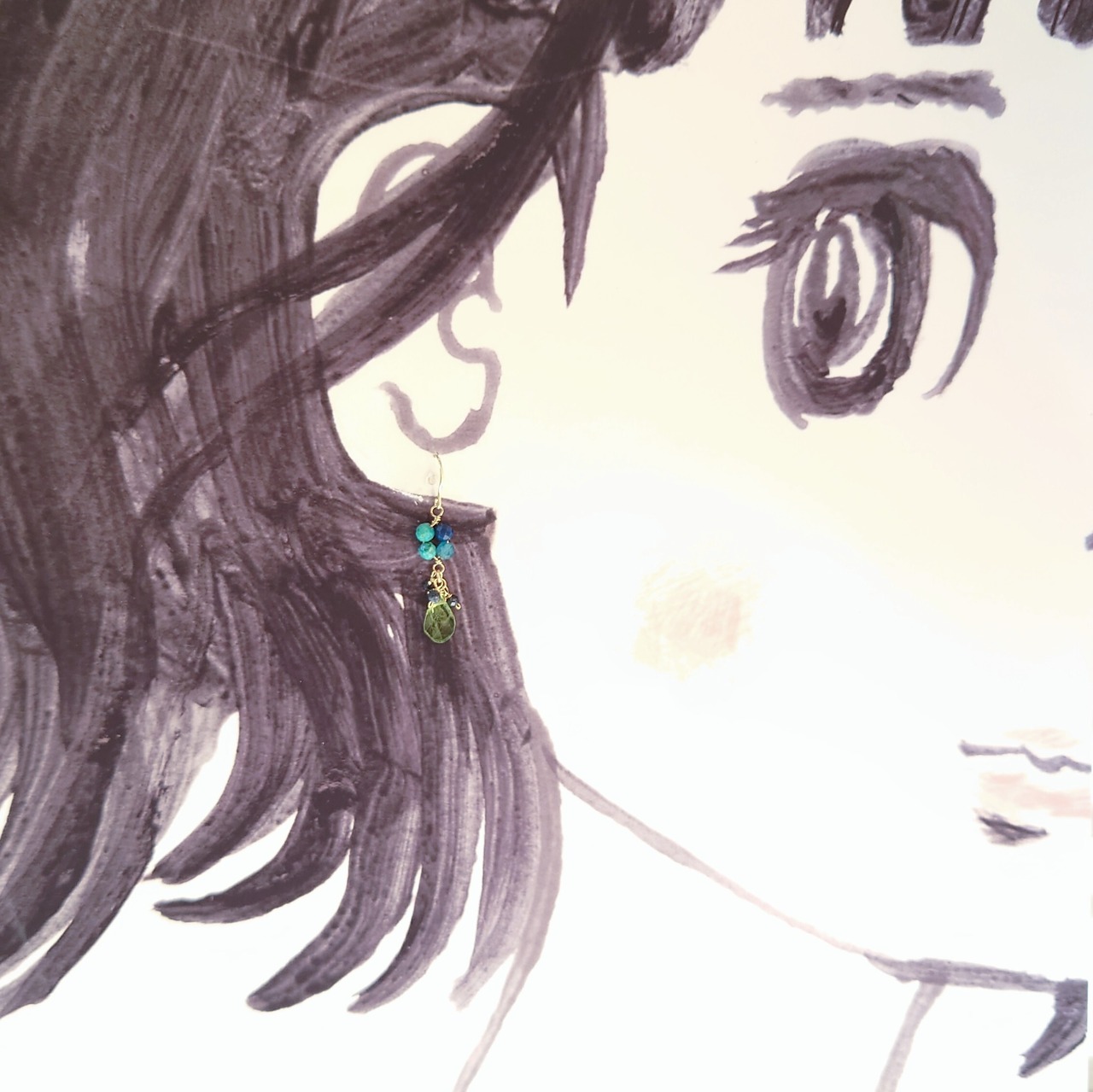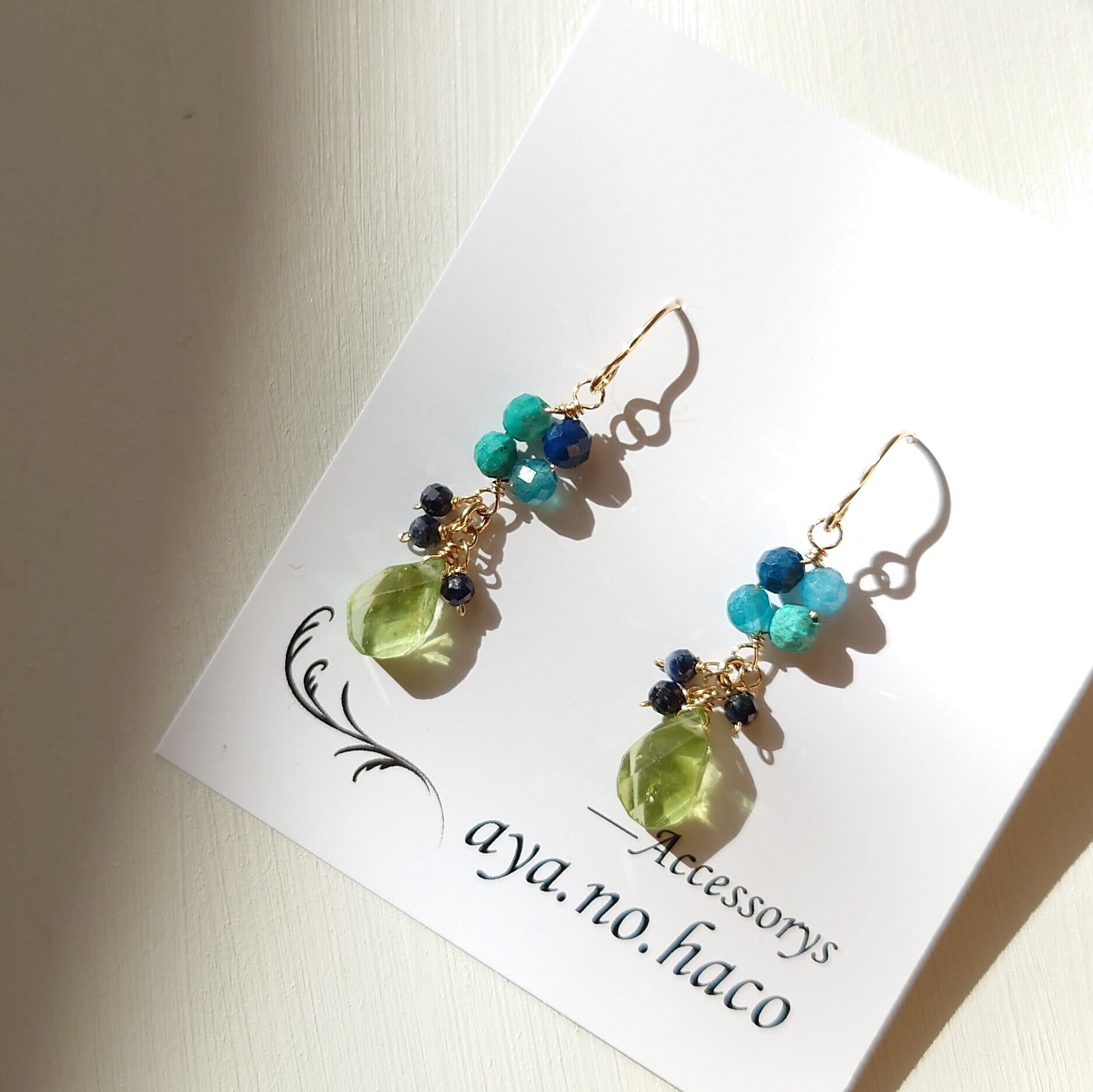 ツイストペアシェイプカットのペリドットに、クリソコラのお花とサファイアの小粒を添えた可愛らしいデザインの色鮮やかなピアス。