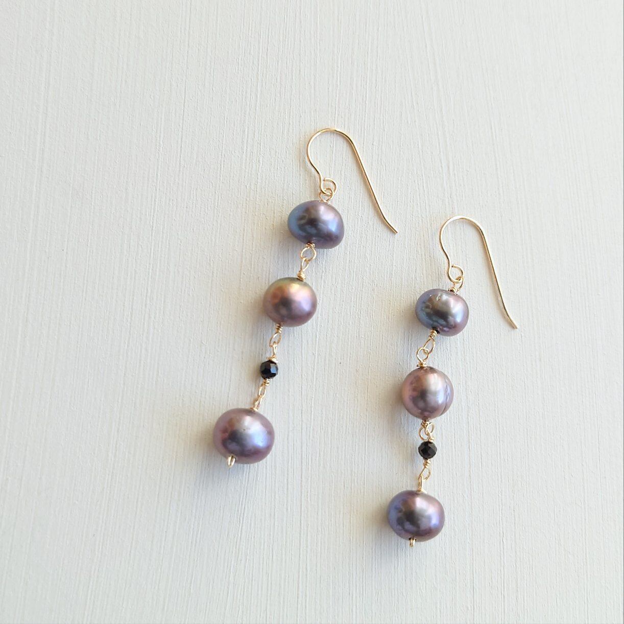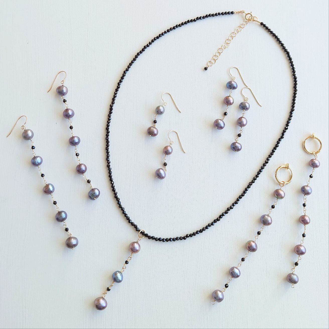 再販 染淡水パール&ブラックスピネルの3粒ピアス